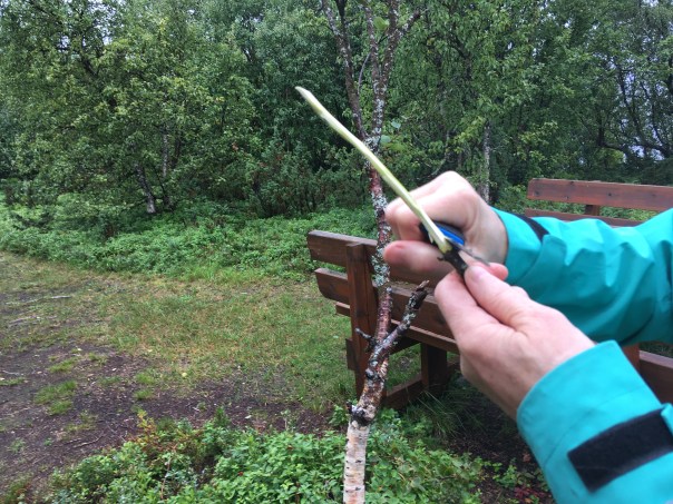 Hilde in the meantime, had helped unpack the bags but had then wandered off. When she came back she was carrying a stick and a knife, so I went to investigate. Any Norwegian schoolchild would have recognised what she was doing. They hand out whittling knives to six year olds here. Most of them survive and by the time they are adults, they have excellent knife skills. But to me, the uninitiated, it was a mystery.