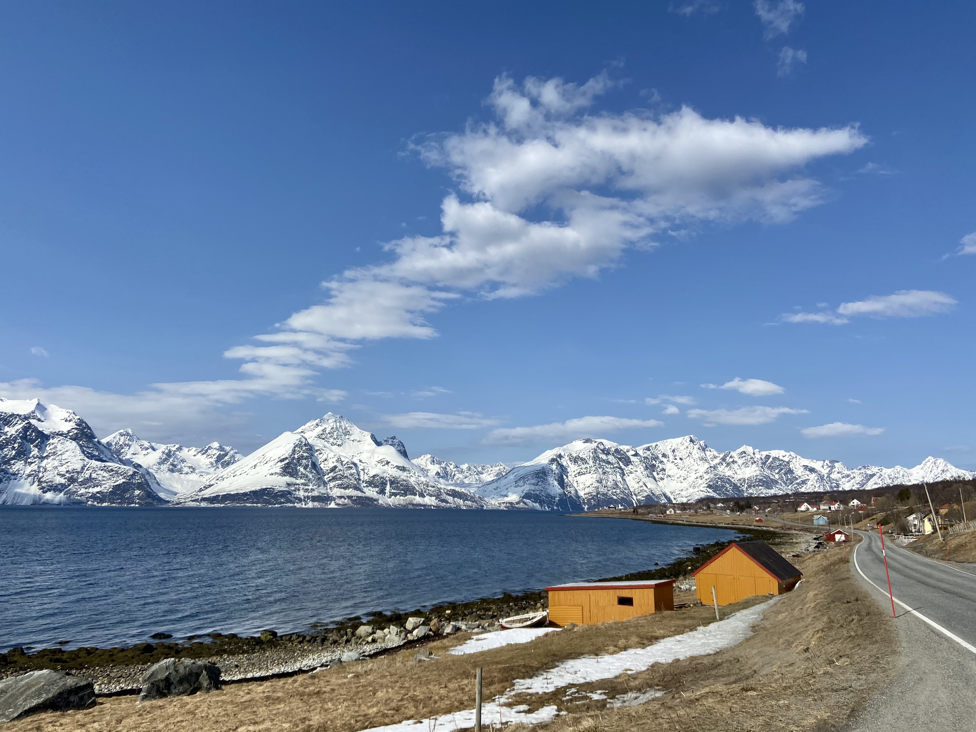 As I neared Storslett, the land beside the fjord stretched out. Small boat sheds, cheerfully painted, stood beside ramshackle frames where cod would be hung to dry in winter. I didn’t manage to take a picture of the frames, but I will try to do so on the drive back, or when I’m out and about with Birgit, who is my mentor for this week.
