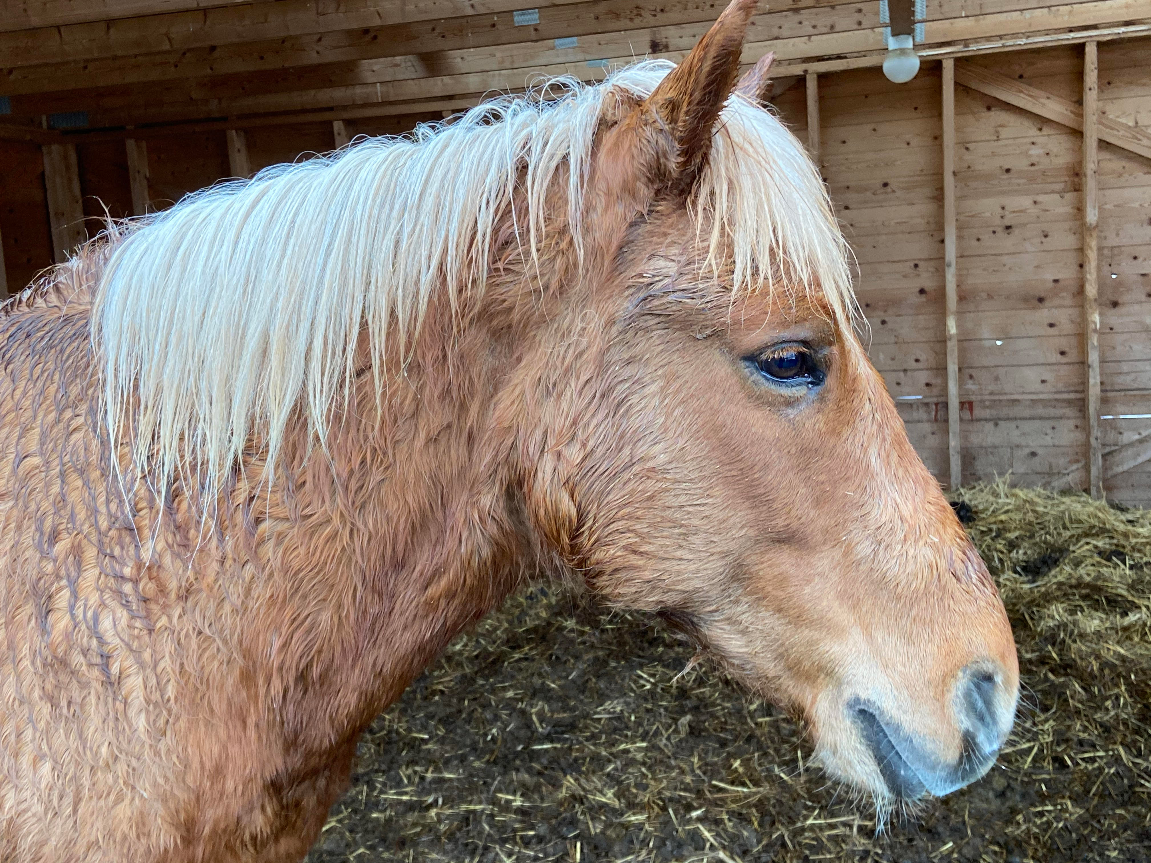 The younger horses are outside. Despite the patches of snow and the dampness of the ground as it melts, they too seemed to be thriving. Birgit tells me they are very even tempered and cheerful, even when faced with injury or difficulties.