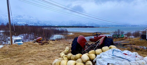 Despite the mud and the snow, we went for a short walk afterwards down towards the fjord. I stopped to take the photograph of the tractor and floats. I saw them on top of a bank as we walked past and I couldn’t resist. Farming and fishing, thrown together, old, but probably still working. Note also the boat with the green deck in the background. The far side is filled with holes, but perhaps there are parts that can be used. And you can also see the ubiquitous wires that spread over so much of the landscape in Norway. Often I try to photograph round them, but here I felt they were very fitting.