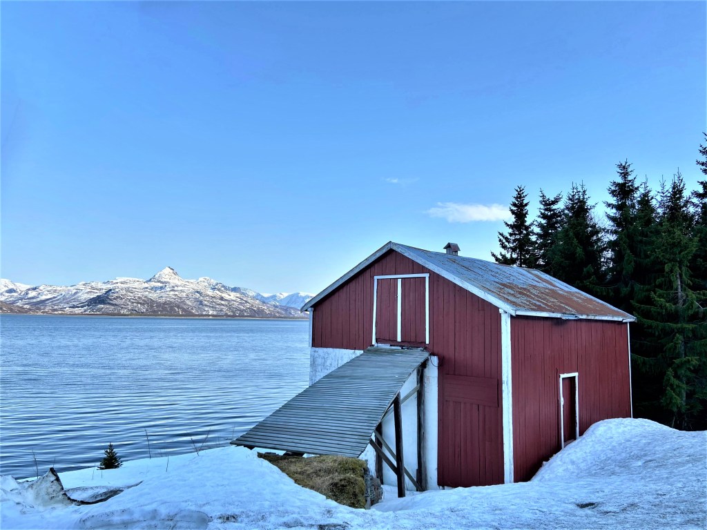 There is a tunnel on the E6 just south of Sørkjosen and Birgit recommended, on Tuesday evening, that I explore the road it replaced. The first section was flat and of the clinging to the cliff face variety. There were road signs reminding drivers not to forget to go round the bends and I wondered how many unwary tourists, distracted by the scenery, had gone over the edge before they decided they really ought to put up notices. The view really was worth looking at. One of the first things I saw was this classic red barn, built into the mountainside above the fjord.
