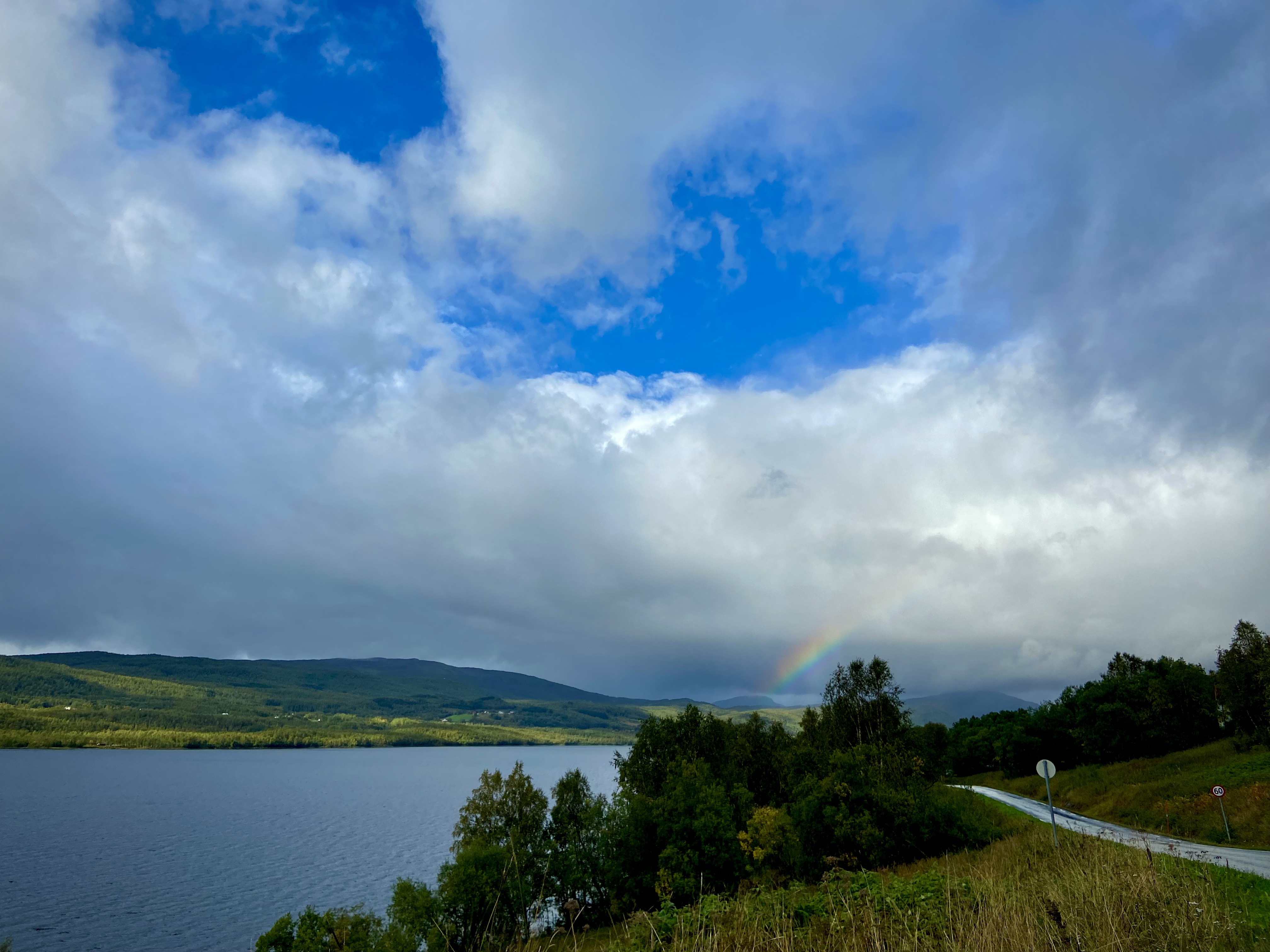 And so after my vaccination, I went to collect him. Fortunately, his wrist was not broken, but he too was signed off for the rest of the week. As Anna was now unwell, it didn’t seem a good idea for him to stay with us, and so I took him shopping, we ate lunch in the car, and then I drove him home. I am used to driving when tired and sick (in the small, rural practices I worked at in Scotland, unless you were bed-ridden or actively vomiting, you were expected to be at work) but I did have to stop for a rest break on the way home. There has been a lot of weather this week: sun and rain and dramatic skies. The photo at the top of the page was where I stopped and below is a rainbow that appeared while we were eating lunch.