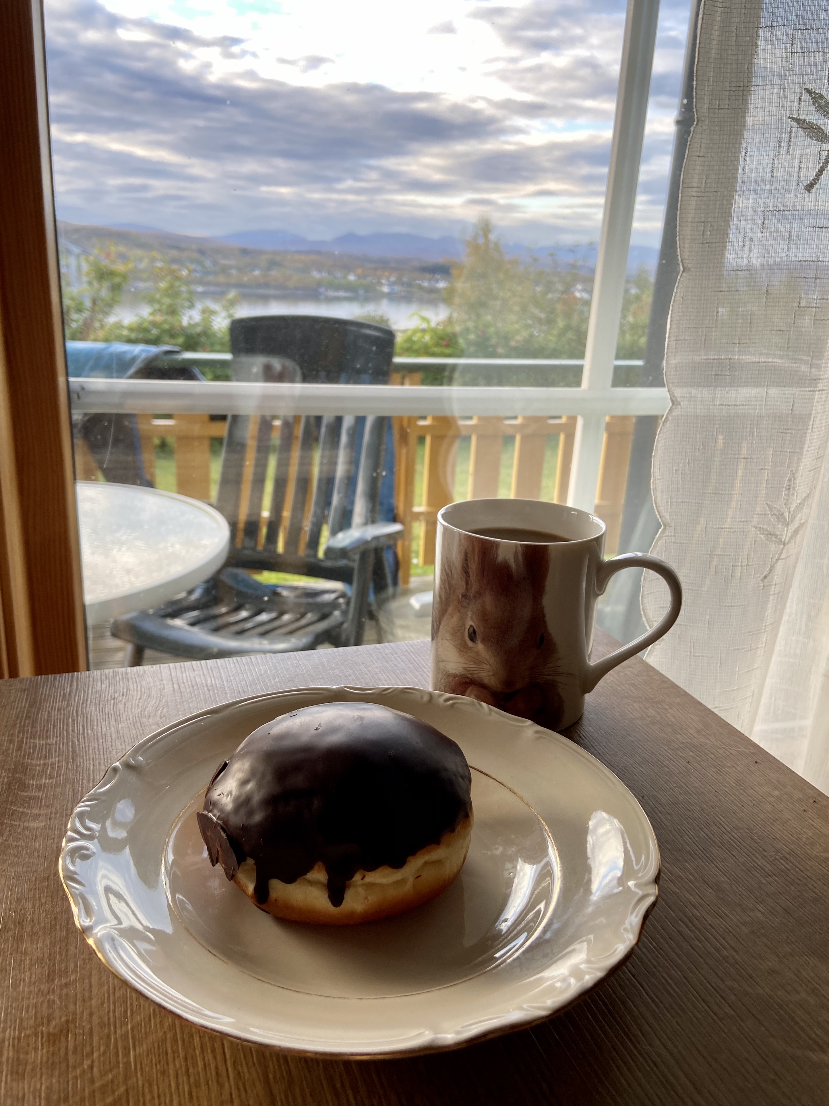 That said, I was pleased to see the return of mørketids boller to the shop I was in yesterday. Mørketid is Norwegian for polar night, which will not arrive until 30th November, so like the mince pies, they are a little early. But I love the seasonality of the foods in the shops here, and this one is specific to the north of Norway. They aren’t as good as mince pies. It’s really a doughnut with dark chocolate and vanilla filling (I have seen pictures with chocolate fillings, but have never located one). Very pleasant with a cup of coffee.