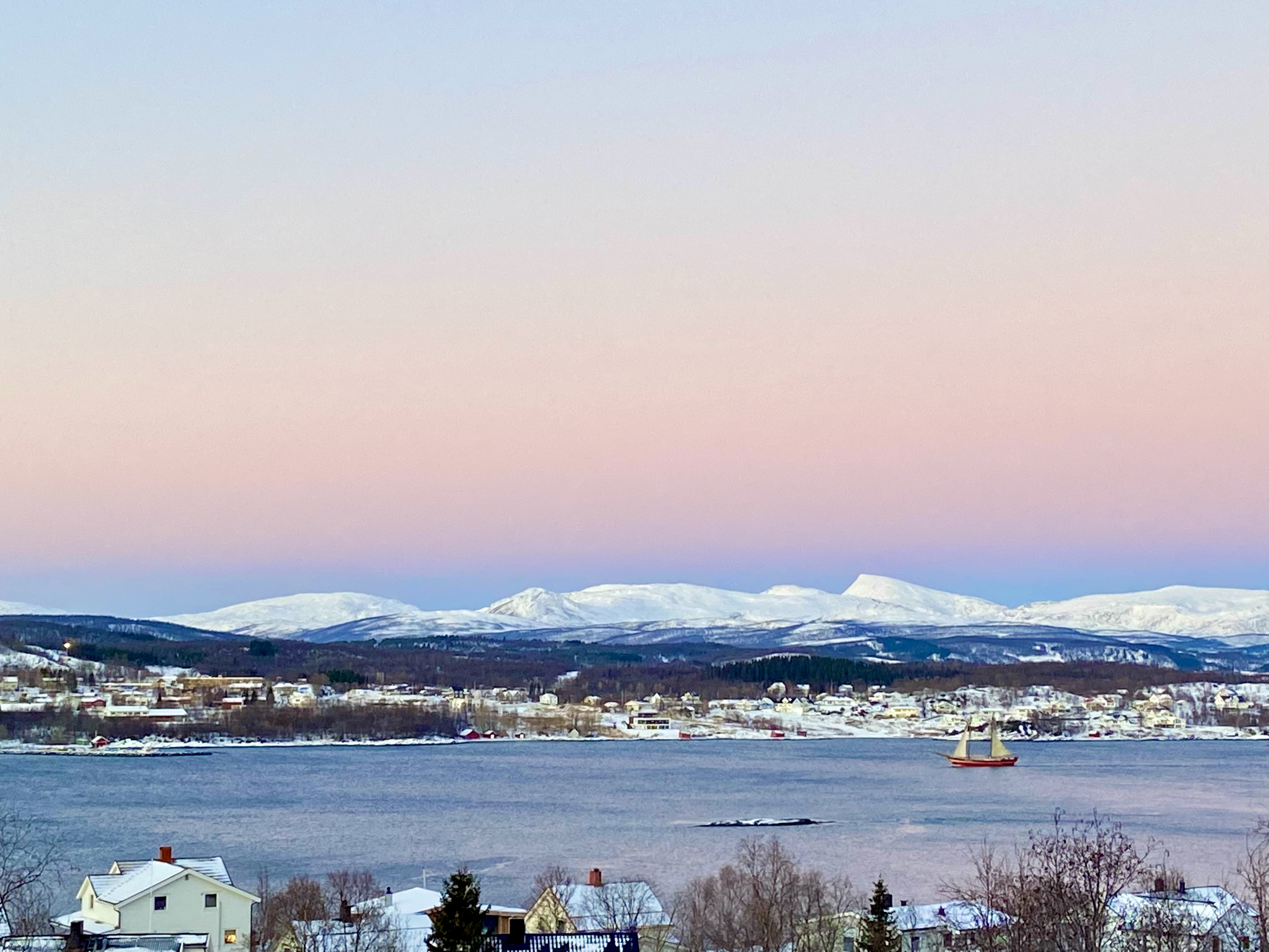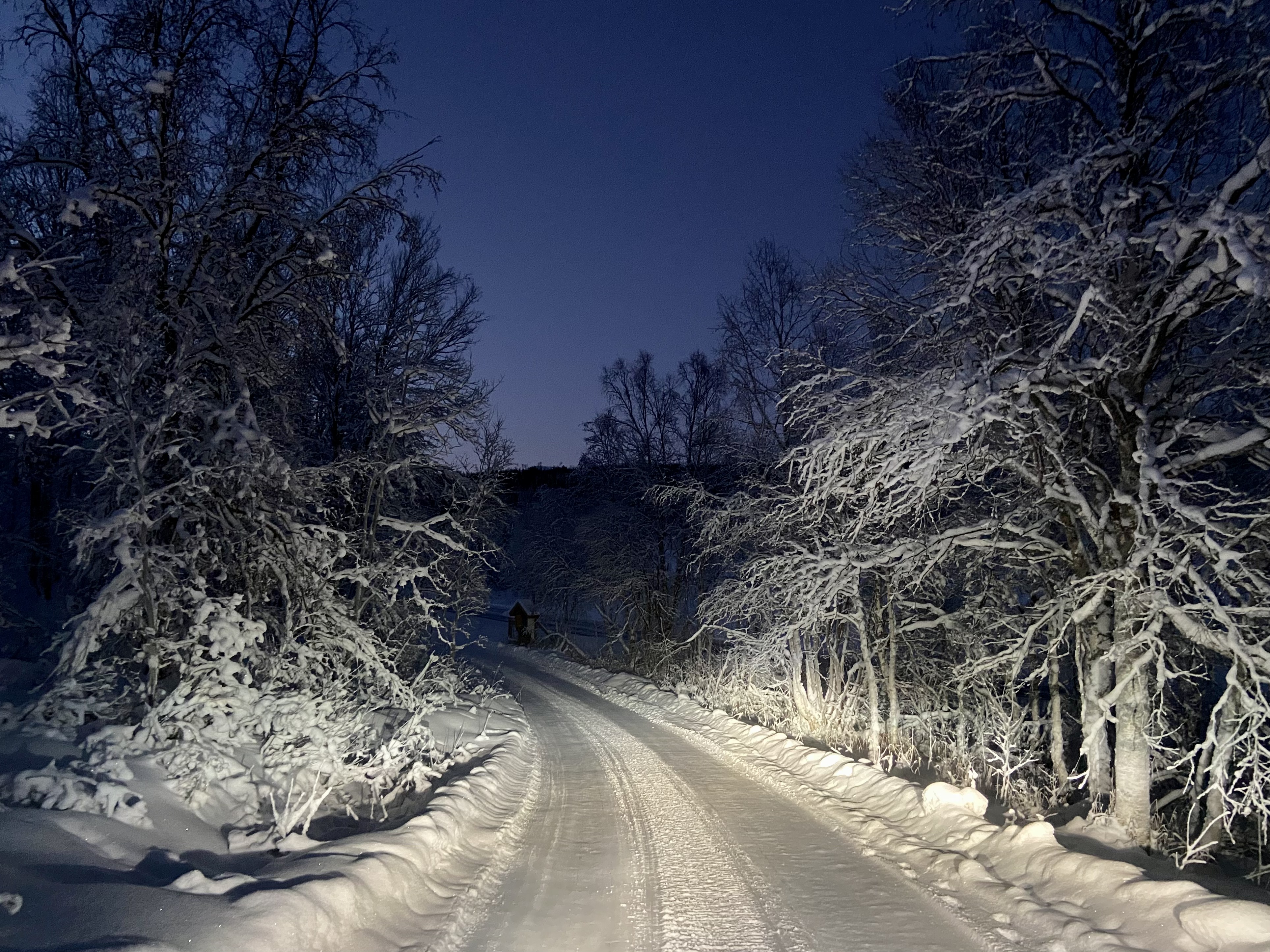 We’re a few days into the polar night now and when the sky is clear, it is layered with pale blue and pink. The temperature has remained low all week and the snow creaks when you walk on it. Often you can smell wood smoke in the crisp air as you walk. This is the view from my garden at eleven o’clock in the morning.