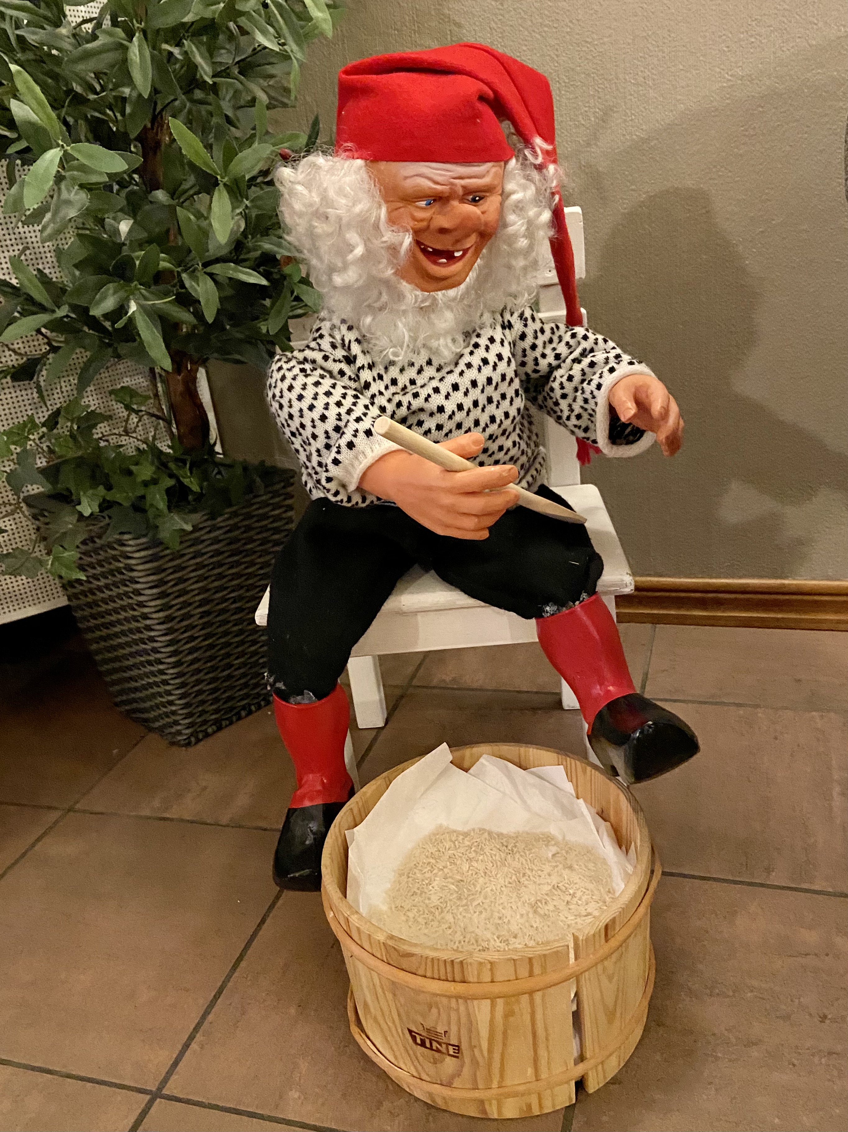Christmas in Norway wouldn’t be complete without Nisser. There’s a programme on Netflix about them at the moment, and the name has been translated into English as “Elves”. But Nisser are nothing like the elves in British and American tradition, which assist Father Christmas or Santa at the North Pole. Nisser are definitely not helpful. Indeed if you forget to give them rice porridge on Christmas Eve, they can apparently become cantankerous. I should imagine they’re a bit like John when he’s expected to put up a Christmas tree with insufficient Pedro Ximenes. Anyway, I found one in the hotel up in Storslett. The poor critter has been given uncooked rice, which will probably give it a terrible stomach ache, but at least they tried.