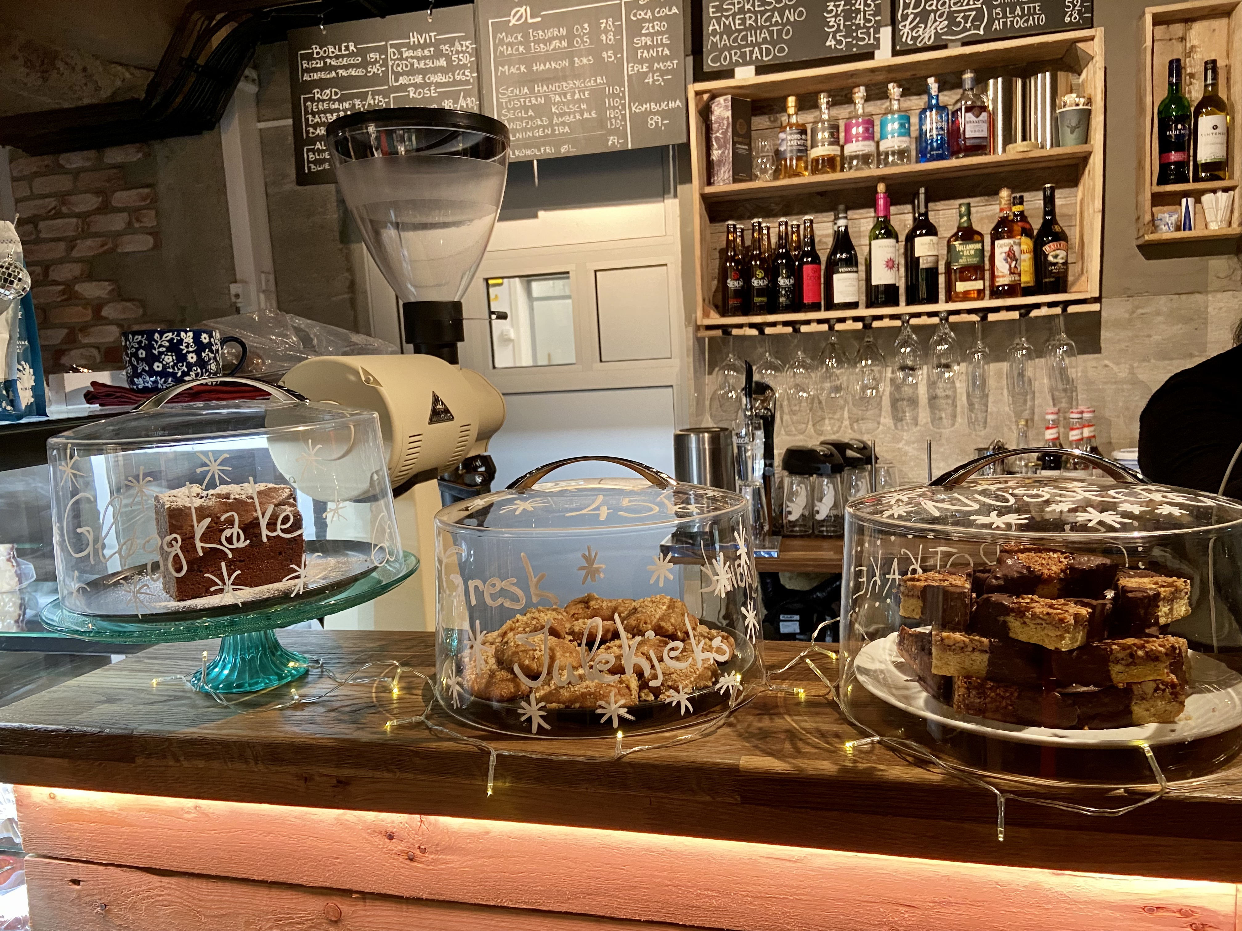 There was sleet hammering on the windscreen when we arrived at Senja Roasters. It was empty as well, but no less welcoming for that. I had come with the intention of trying the nussecken I had seen when I went before, but this time there were three kinds of Christmas cakes lined up on the counter, so Anna and I decided we would share a piece of each between us.