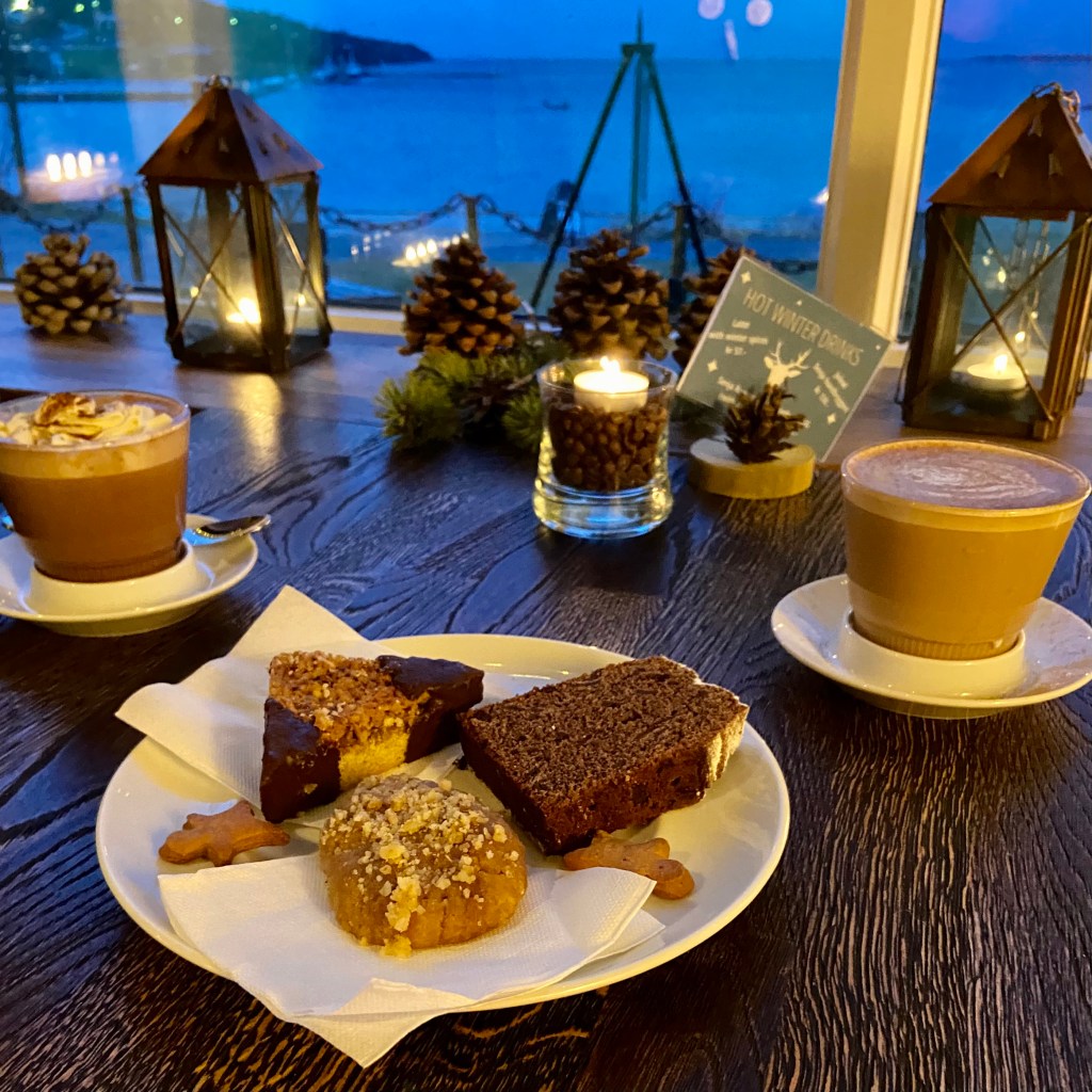 We sat down and enjoyed the cosy decorations against the backdrop of the half light outside the window, where the wind was flitting across the bay, stippling the water in wild flurries.