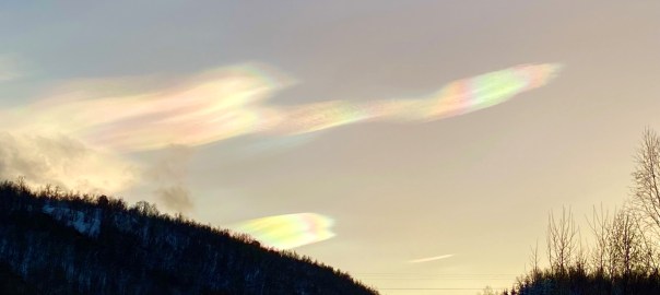 I looked up the phenomenon when I got home and found out that these are nacreous clouds, which form when the air is very cold and the sun is just below the horizon. Another beautiful discovery about my adoptive home here in the north.