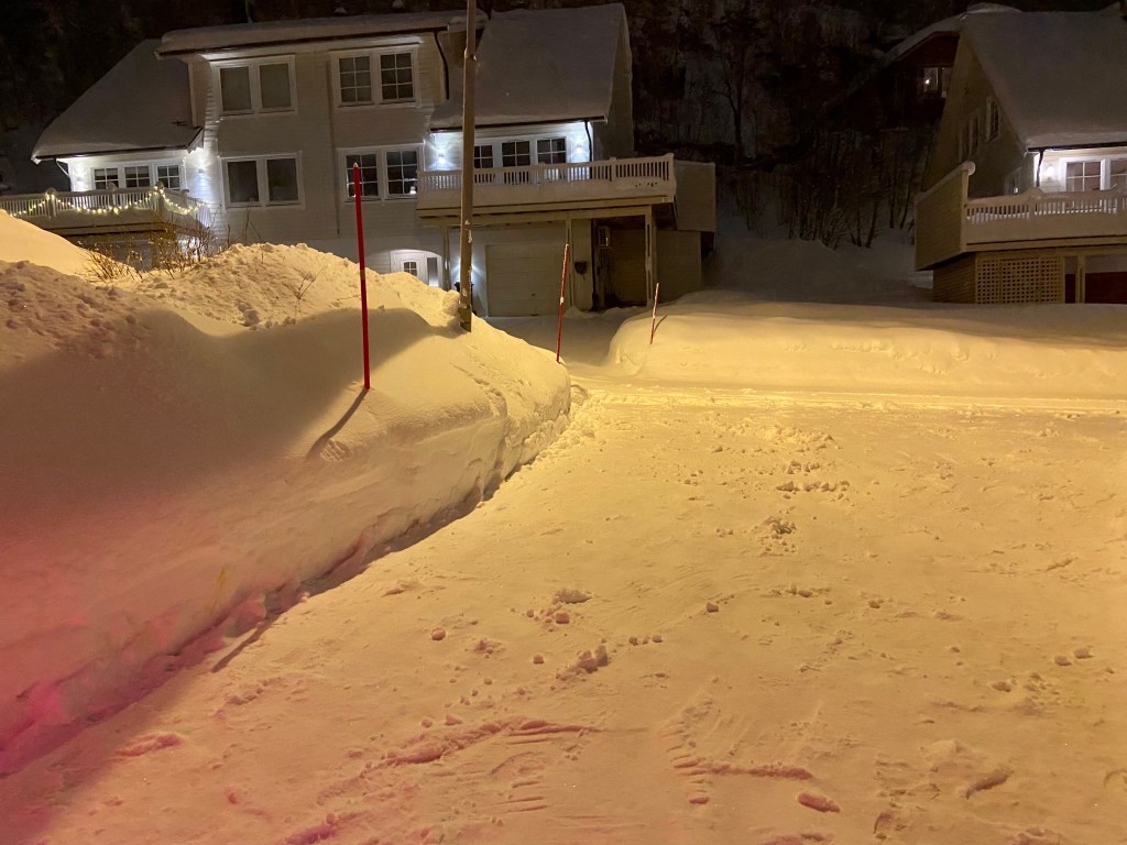So at about three in the afternoon, with heavy snow still whirling all around, I decided that as the driveway was still relatively clear, we should make our escape now and get part of the journey done on Sunday night. Rather than spend a sleepless night at home and getting up early, we could drive to Vollan (which is about half way to Tromsø).