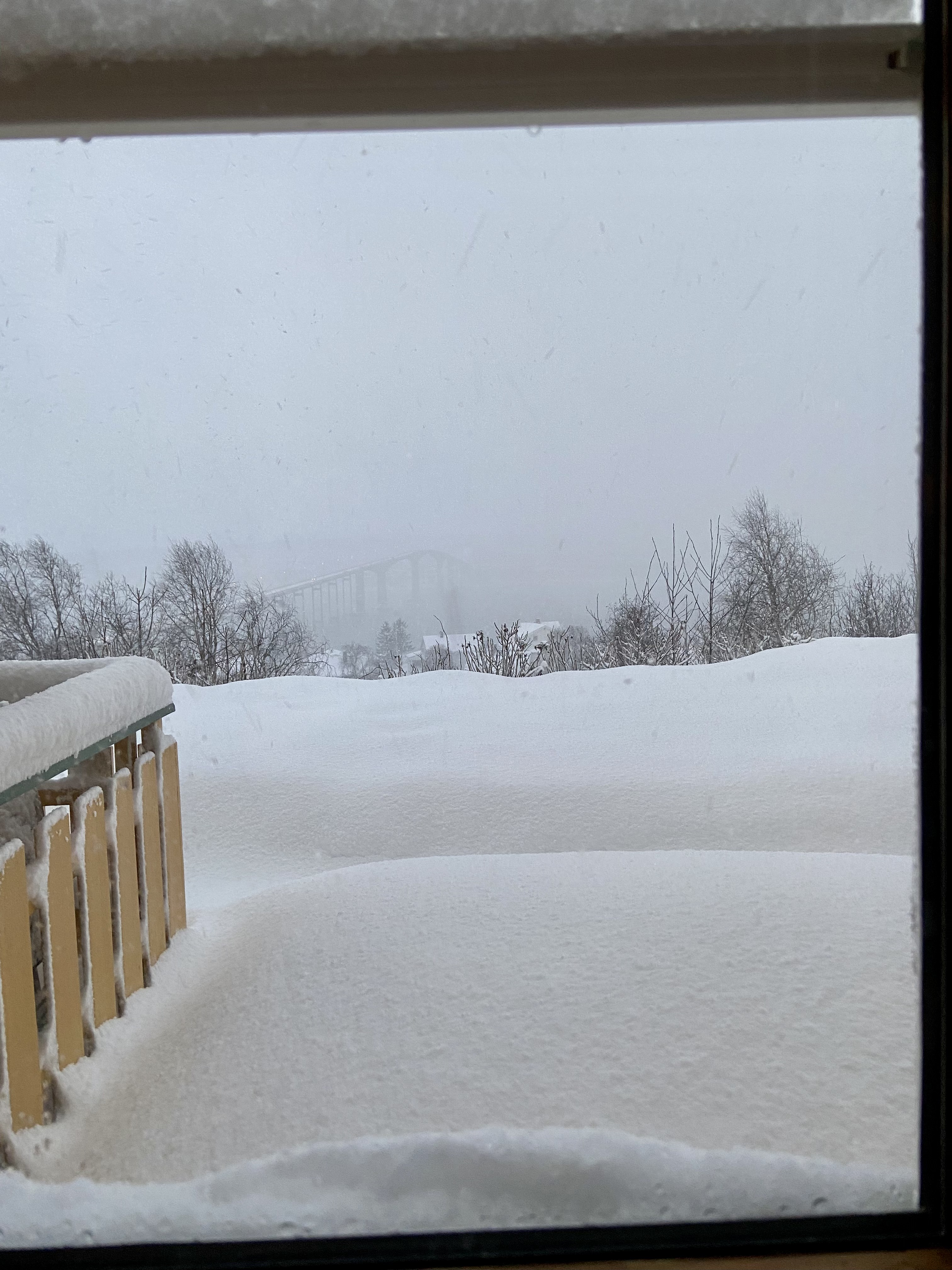 But last Sunday was complicated by the fact that Andrew and I had to go to Tromsø in the morning. I had a doctor’s appointment and he had an appointment to get his wisdom teeth taken out. We didn’t have to be there until eleven, but it’s more than two hours driving on a good day. It was worrying me that, if we awoke to a buried car then had to drive through a blizzard, we might be struggling to make it in time, especially as I don’t know my way round Tromsø yet.