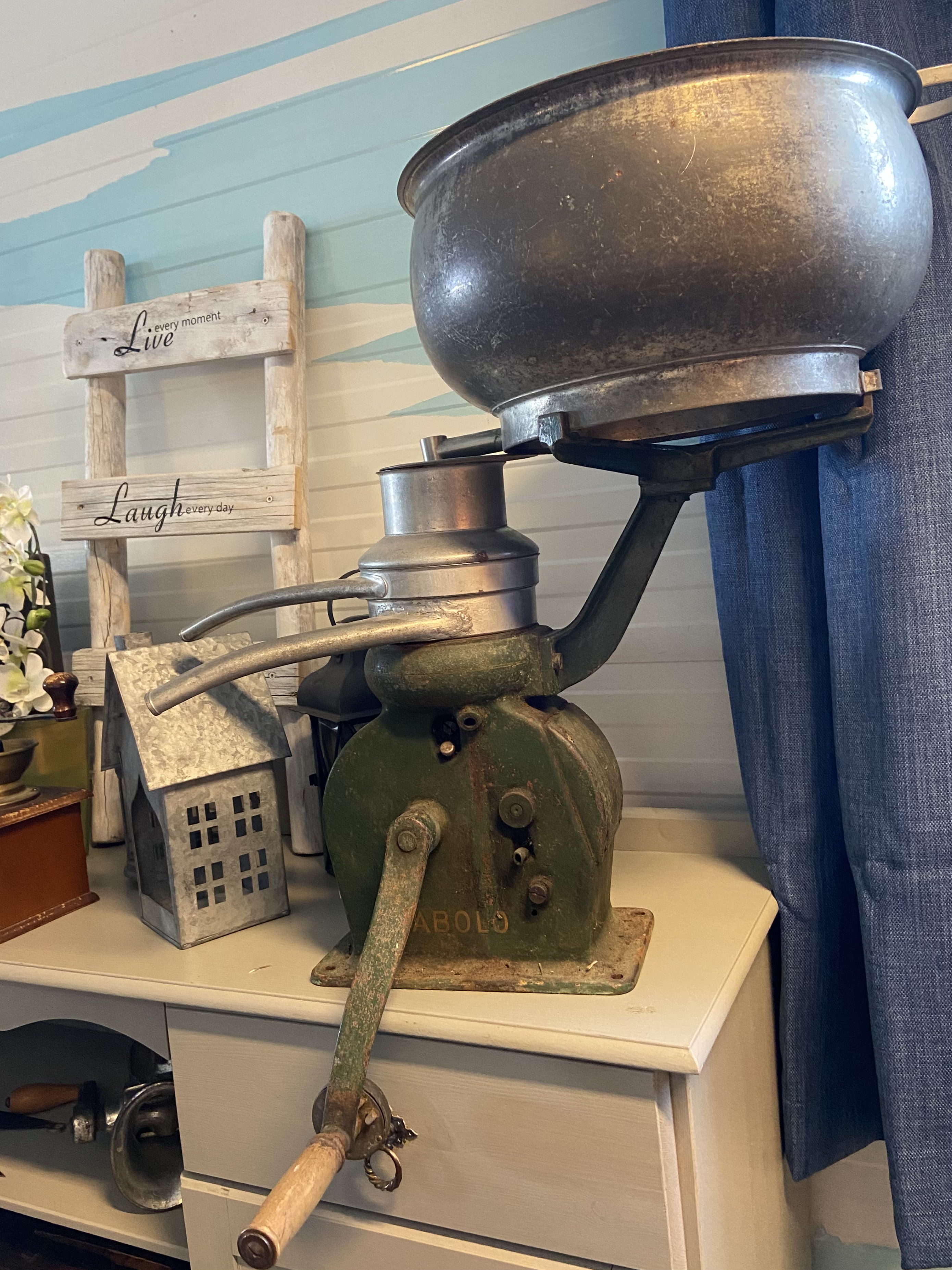 But there was one object that I didn’t recognise, and so I asked her about it. This, she told me, is an old gadget for separating out the milk from the cream. Those of us who are old enough to remember milk in a bottle on the doorstep will also remember that the cream is lighter than the milk, and so it rises to the top.