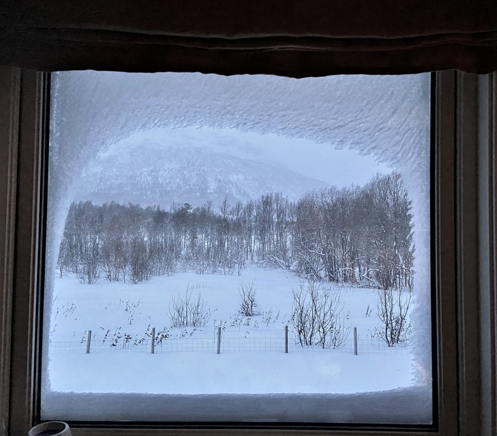 To our relief, John’s ankle wasn’t broken and he didn’t need to stay in, but as we set off to drive back, it started to snow heavily. Visibility was awful and for a while, I couldn’t manage to limp along any faster than 40km/hour. The headlights clogged up with snow and the windscreen wipers were icing up and smeary and I had been up since four in the morning. Once again, we limped along until we could find a place to get off the main road. Fortunately, John had declined to take any strong painkillers and even more fortunately, it was his left ankle that was damaged and my wonderful, workhorse car is an automatic. In any other circumstances, I wouldn’t have let him drive, but driving onwards felt almost impossible. Still, we contemplated stopping at Vollan Gjestestue, which would be halfway home. By some miracle, the snow stopped at Nordkjøsbotn and John felt able to carry on and we made it home at about nine in the evening.