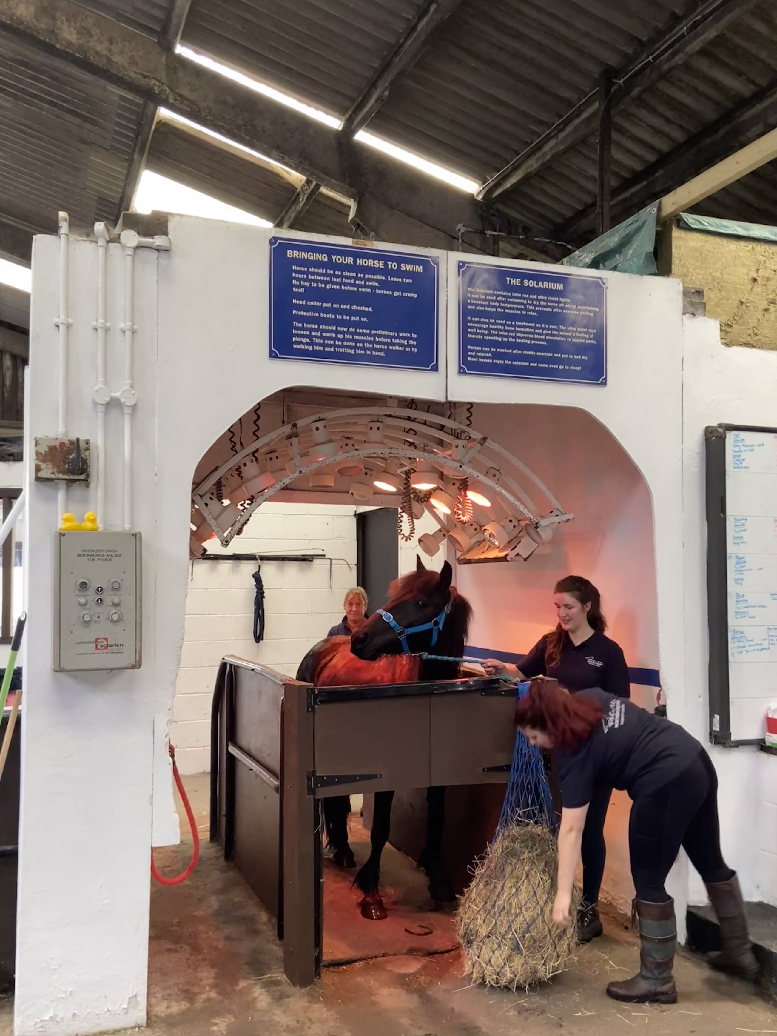 Having swum round, the pony in the picture was taken out, towelled down, then treated with oils to replace the natural oils that would have been removed from his coat. He then was walked into a solarium to dry out a bit.