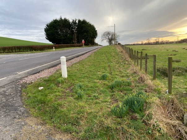 What I hadn’t realised is how offset this “crossroads” is. If you look closely at the picture above, you can see tyre tracks in the grass. They stop at the daffodils. The right turn is on the left of the photo and this is looking back at the brow of the hill we all came over.