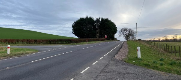 What I hadn’t realised is how offset this “crossroads” is. If you look closely at the picture above, you can see tyre tracks in the grass. They stop at the daffodils. The right turn is on the left of the photo and this is looking back at the brow of the hill we all came over.