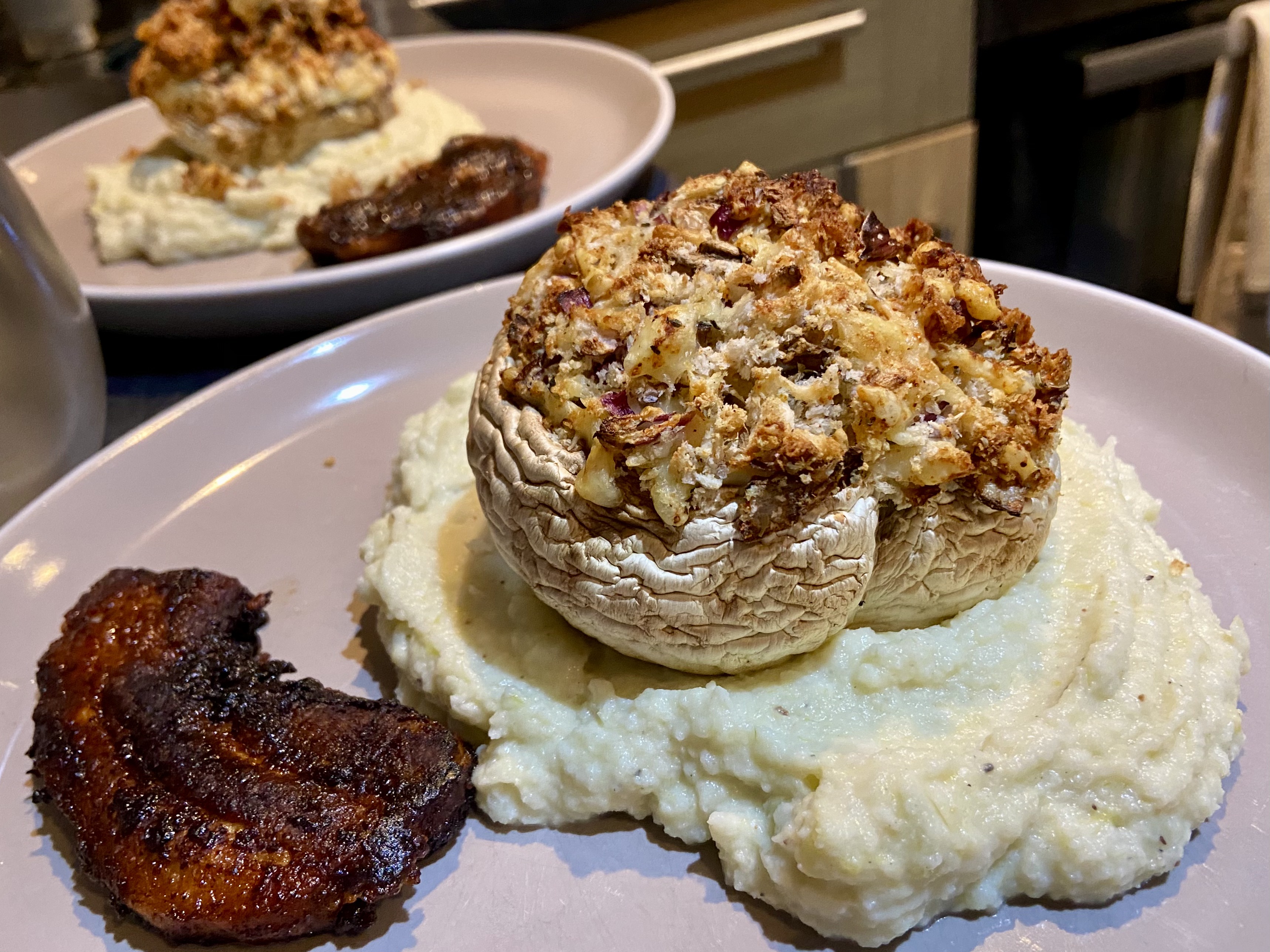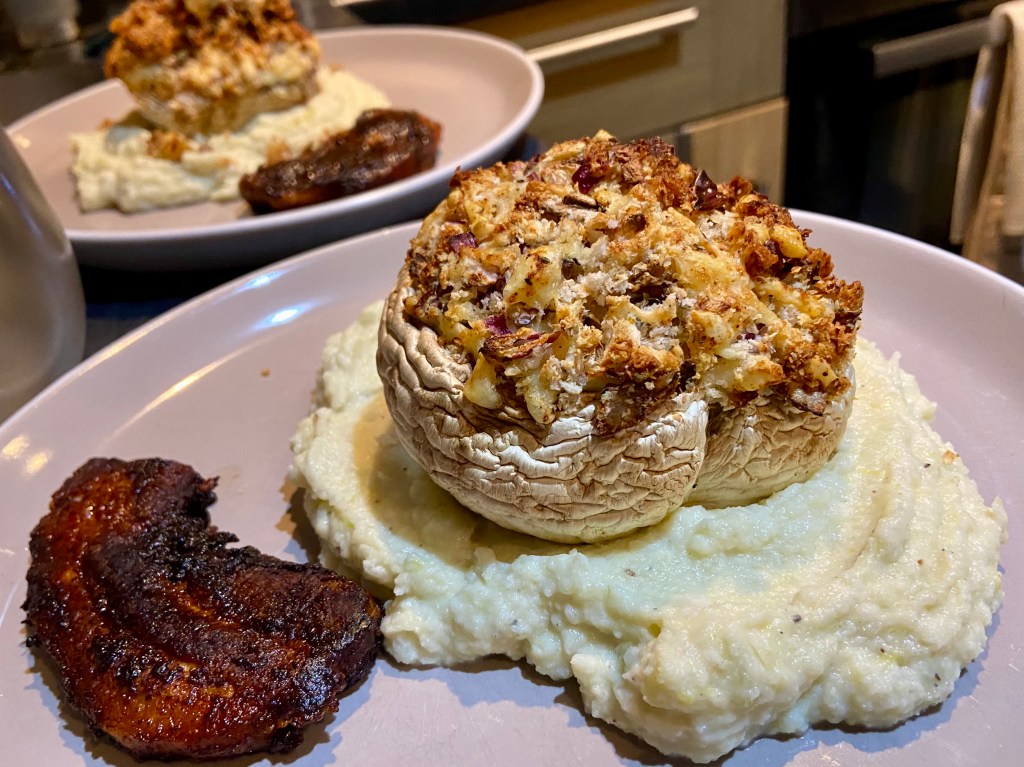 I spent Tuesday and Wednesday in Dunfermline. More about that next week, but I was lucky enough to stay with Valerie in Airth, from where it was only a half hour drive. We had planned to cook stuffed mushrooms when I was there at the weekend and we did that, using garlic and herb cream cheese with a crumb, cheese and onion topping. Cauliflower and leek purée made a wonderful accompaniment, with a slice of fried belly pork on the side. Delicious!