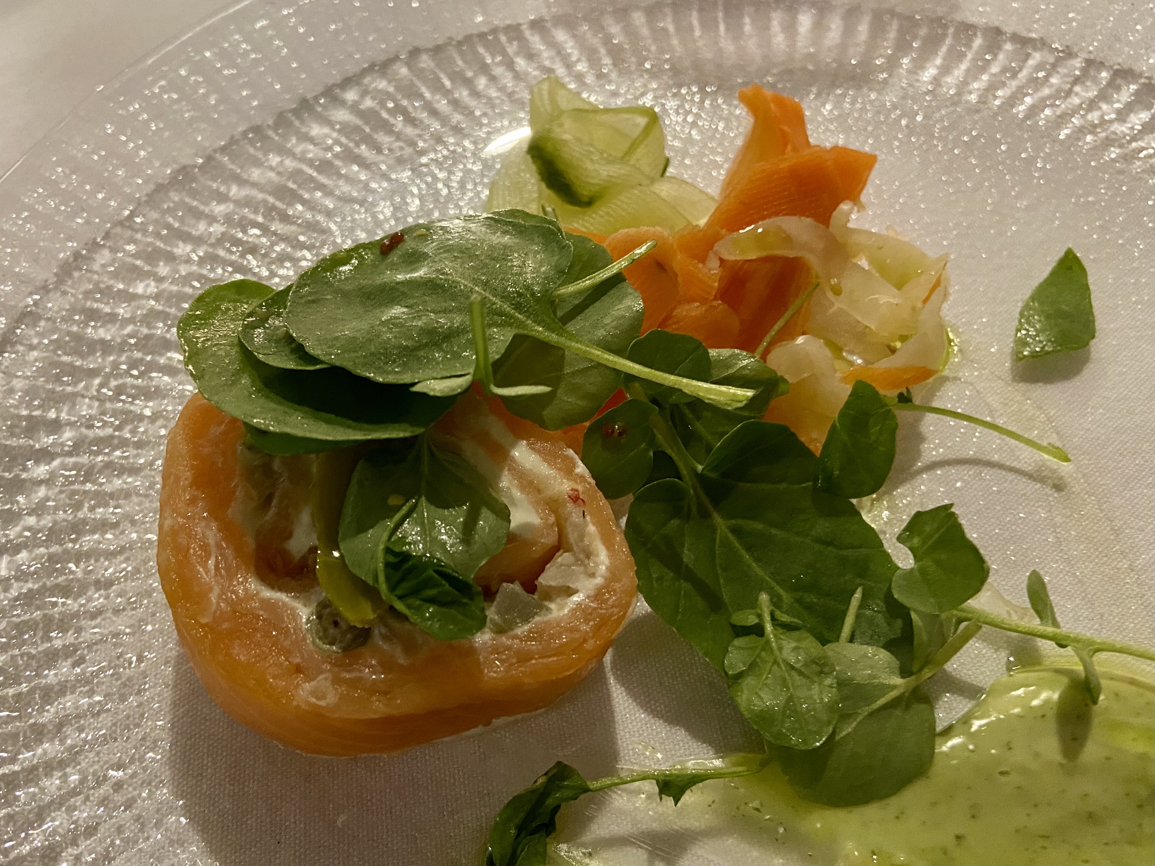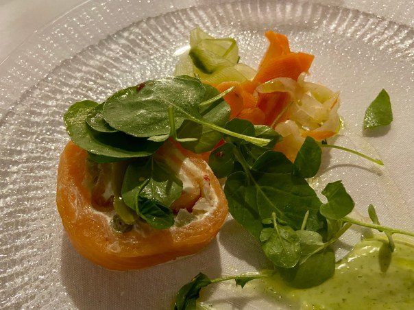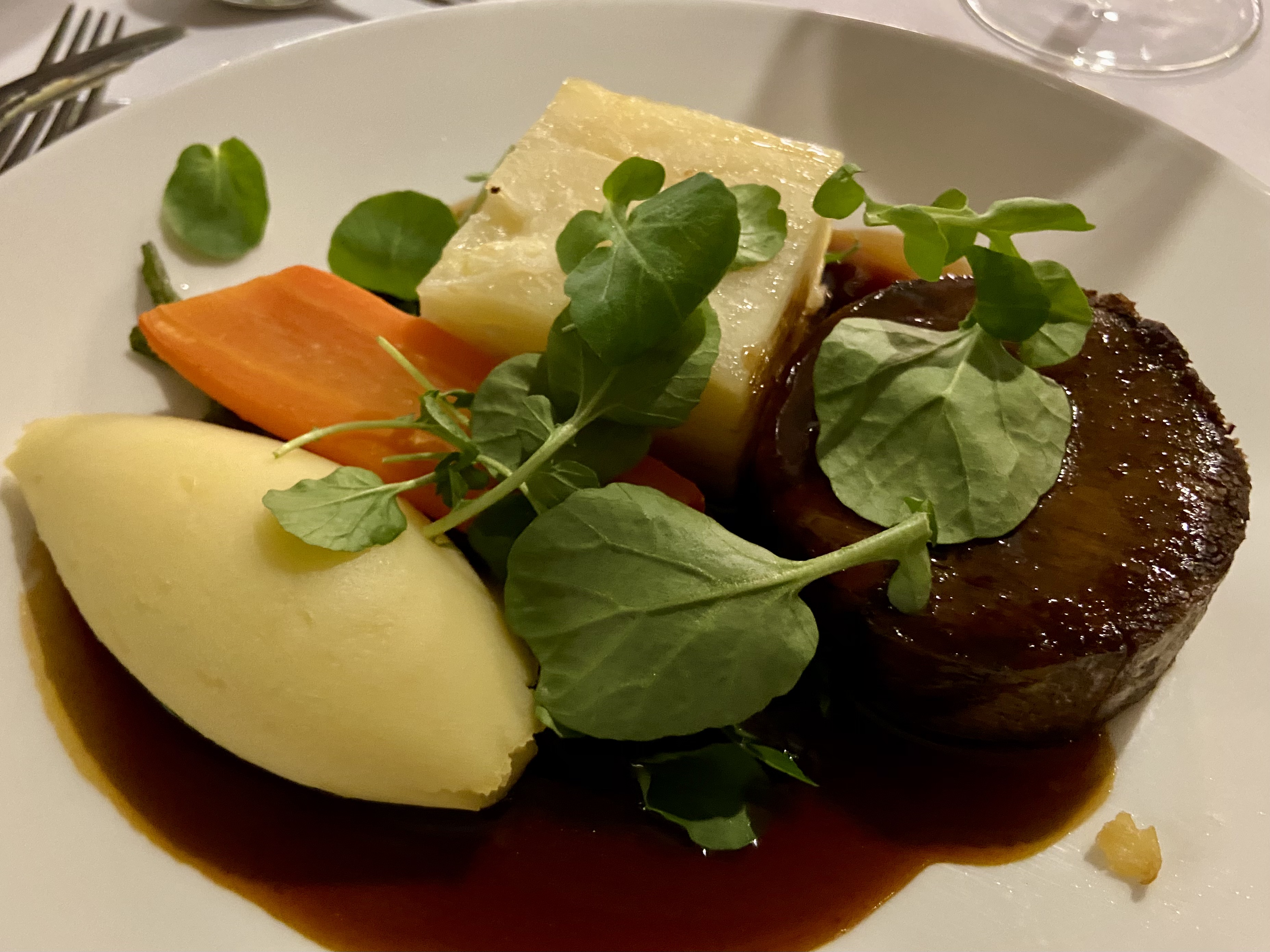 24 Hour Braised Beef followed. We were in Ireland, so I was pleased to see there were two different types of potato on the plate. Can’t beat a good Irish potato! I’m no longer able to eat double my weight in food, so this course was passed round the table, but the meat was so tender that you could cut it with the proverbial spoon.