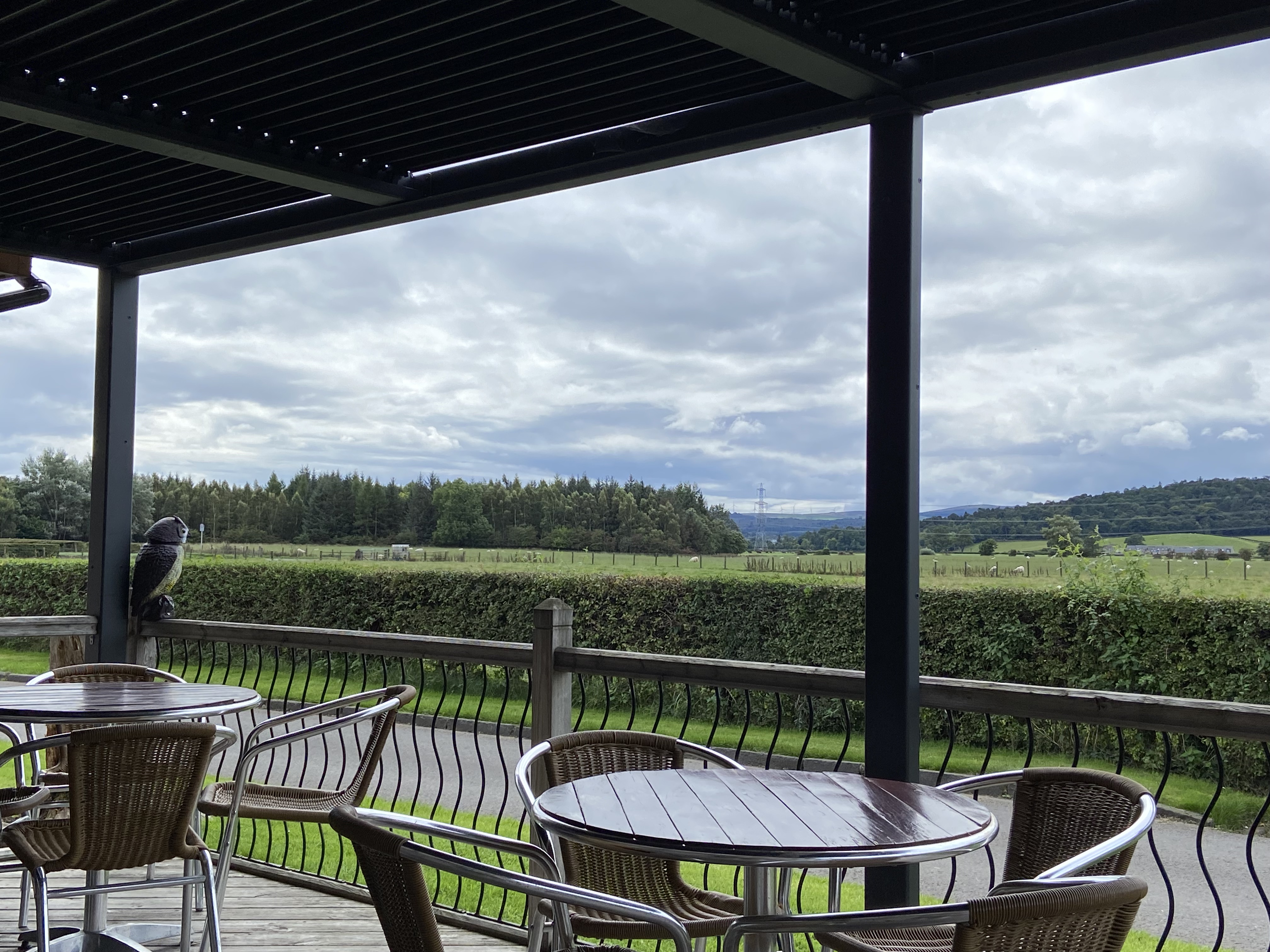 The café (and gift shop) were on a farm set against the backdrop of the Ochil Hills. The picture at the top of the page was the view from the car park. This is the view from the covered terrace where we sat.