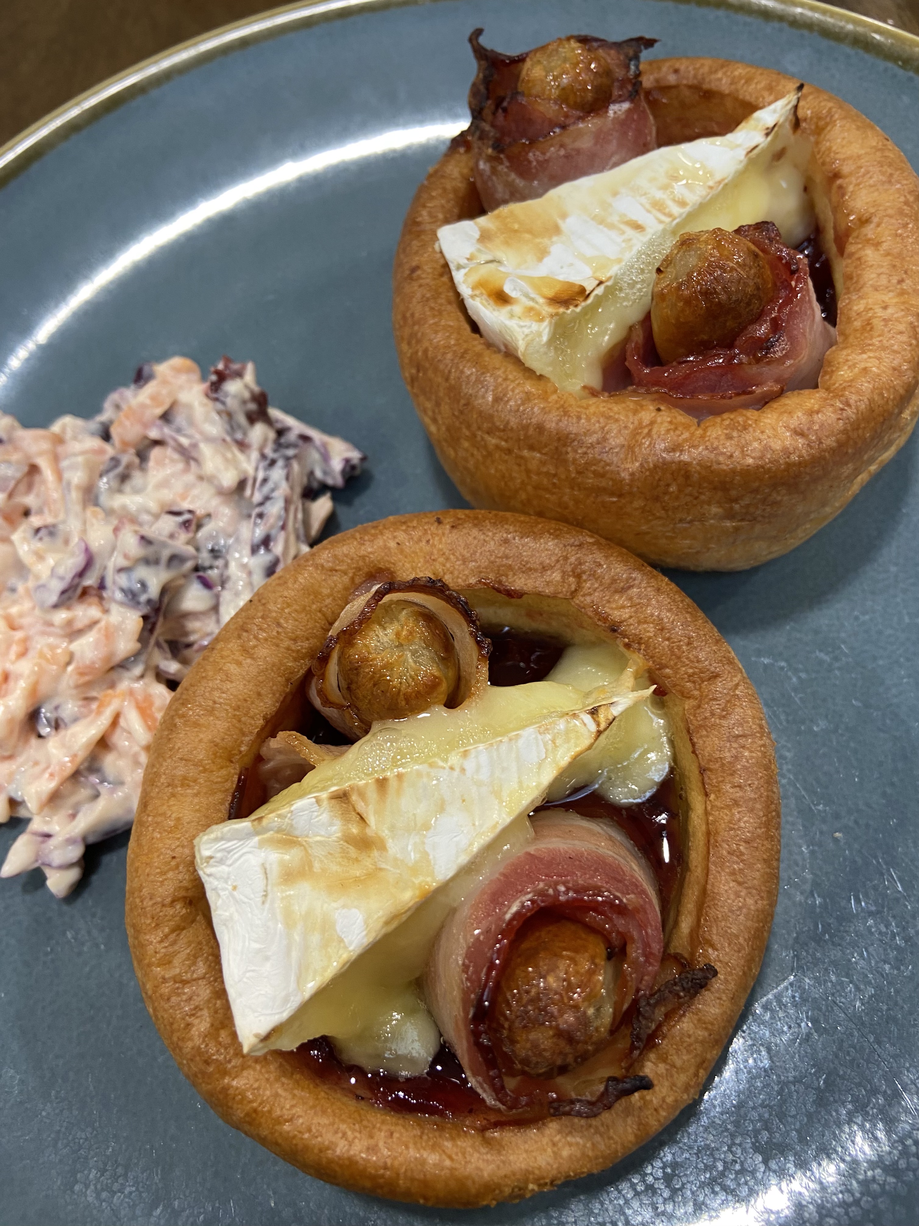 It wasn’t easy to photograph. I’m not sure how enticing it looks, but reader it was delicious! Cranberry and Brie is a common combination. I’m usually wary of adding in bacon. For me that is gilding the lily because the sharpness cranberry offsets the creaminess of the Brie so well. But this time, with the honey accentuating the salty and crunchy bacon, alongside that heavenly Brie and cranberry combination… well it was divine. I’m not sure I detected any gravy (I love gravy) but for a hot meal on a wet November day, it was perfect. And if you want to know what was festive about the slaw? That had cranberries in it too. Not sure they added much, other than it being an odd colour, but it’s a forgivable experiment! All in all, this was a wonderful meal.