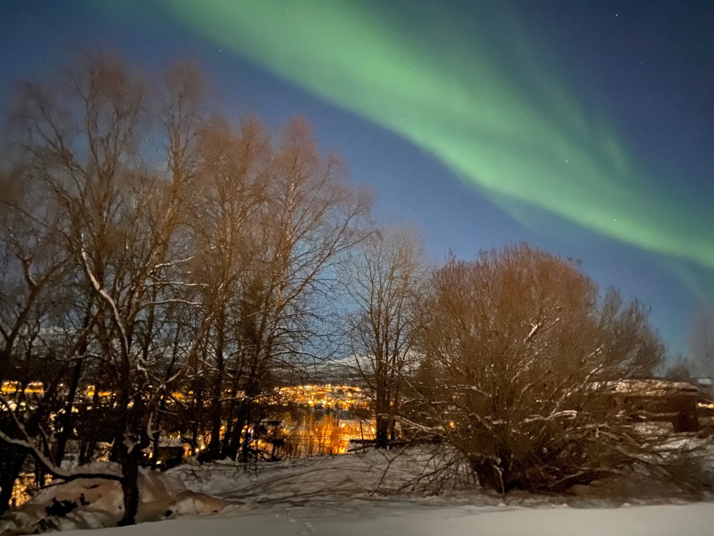 The forecast was for cloudy skies all week and I had resigned myself to not seeing the Northern Lights. I did glance out of the window as I was on my way to bed that night and chanced to see stars. Stars meant the clouds must have cleared a bit, so opening the door, I went outside and, to my delight, the sky was indeed lit up with that gently dancing river of light. Standing outside in the snow, it felt timeless and wonderful as ever.