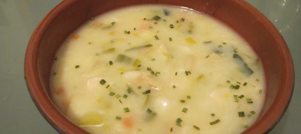 4) Simmer for a further 5 minutes, then add the fish. Allow to cook for a further five minutes, then add the chopped chives and serve.