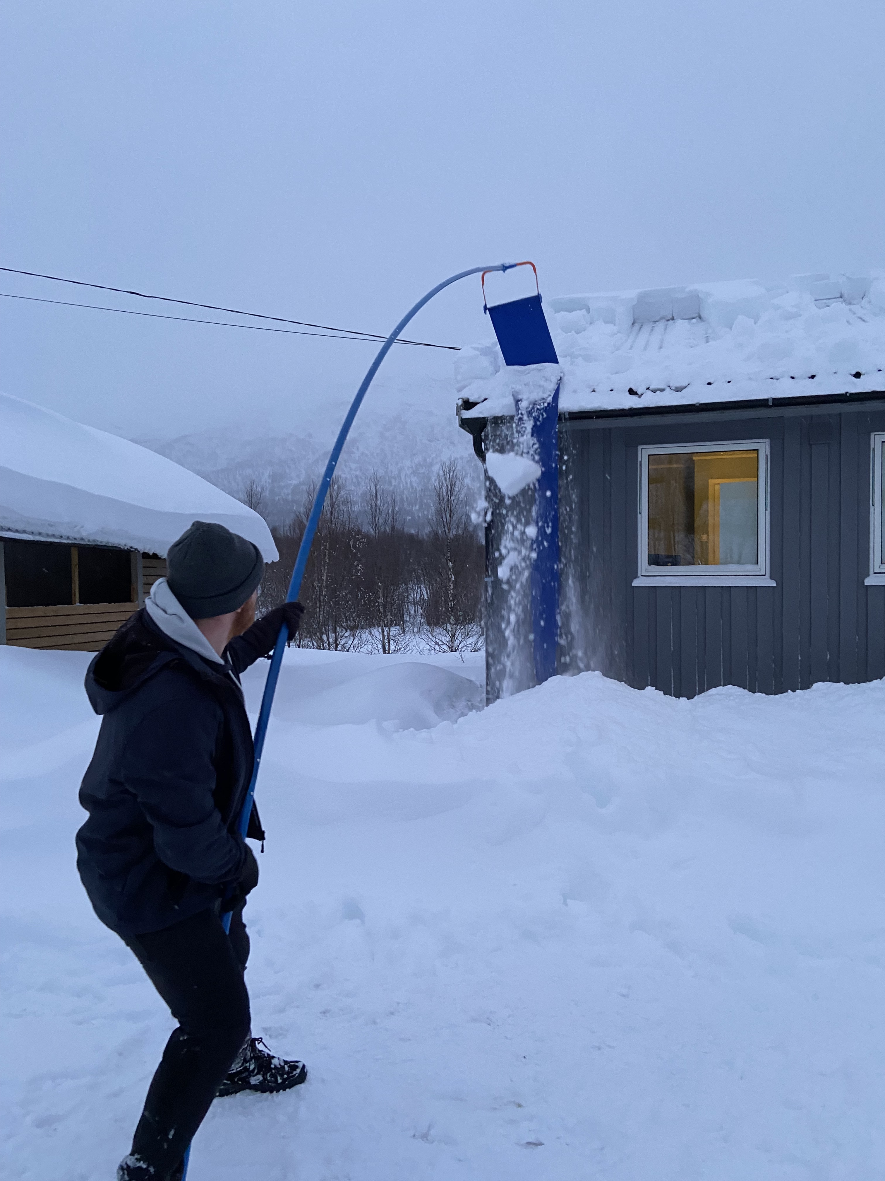 For those who read last week, the roof did get cleared in time for Christmas. Several shops were open on the morning of Christmas Eve and we managed to buy the extension to the roof rake – the last one in the shop, no less! Here’s a photo of John using it. The frame at the end of the rake cuts through the snow and, if positioned right, it slides off in huge chunks down the long strip of slippery material.