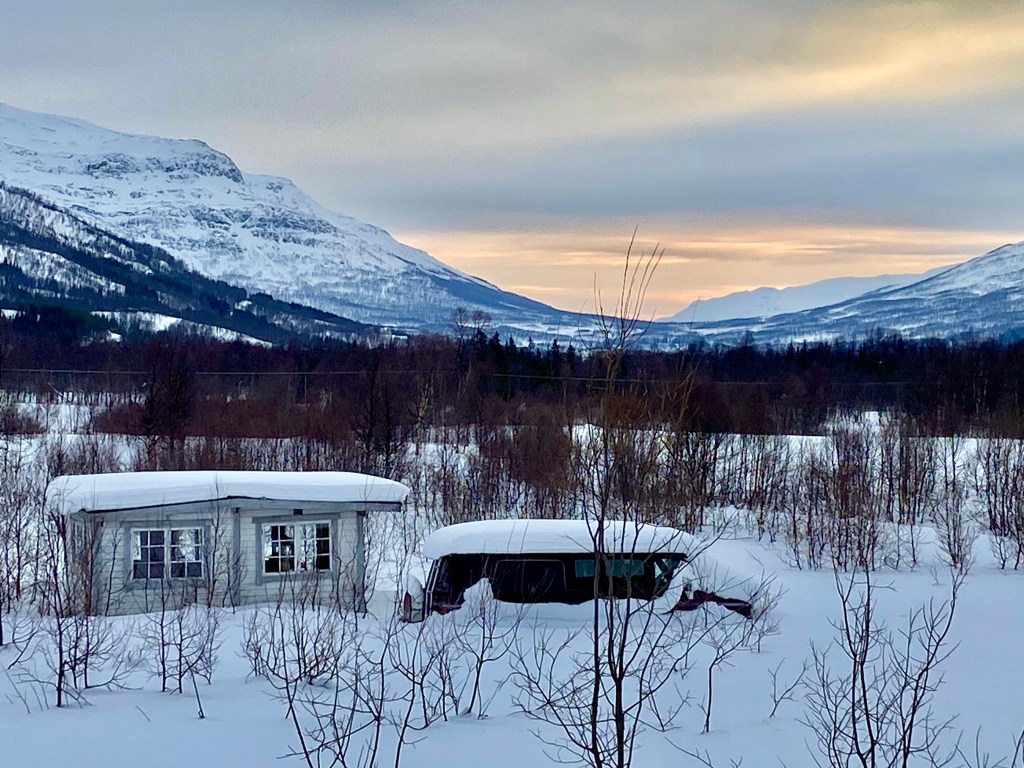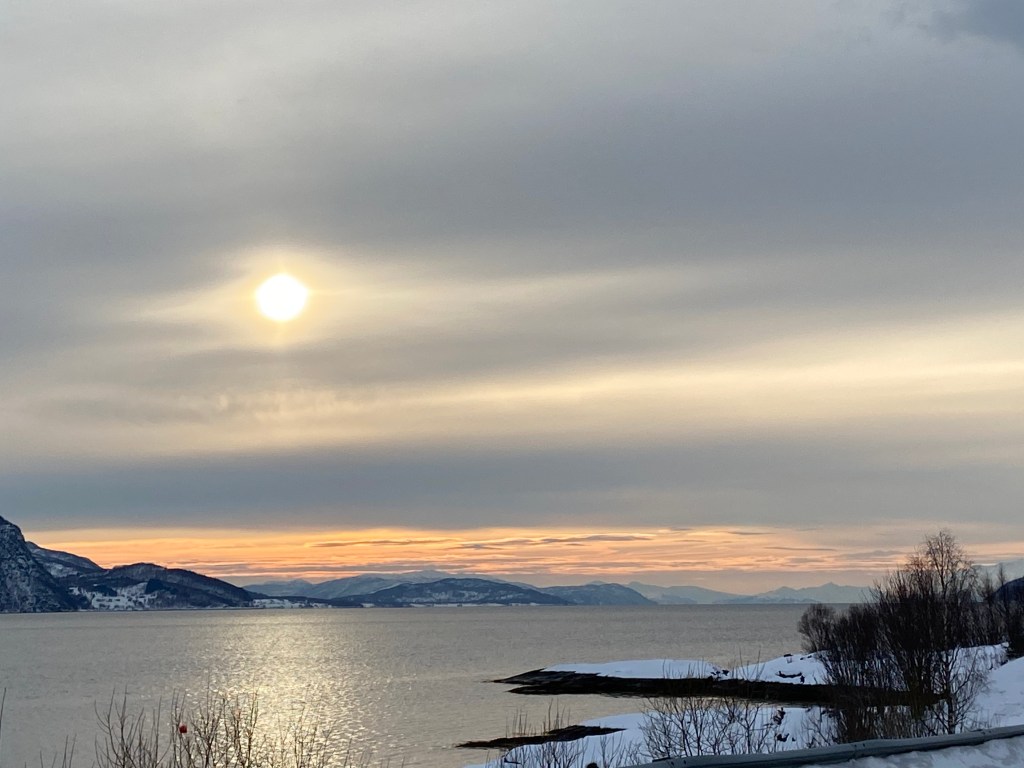 I took a couple of photographs on the way home on Friday, after I had dropped Gry off. The temperature has dropped suddenly here. It snowed last weekend and then fell away to between minus seven and minus fourteen. As usual when that happens, the sky is clear, and as the polar night approaches, the air becomes very clean and cold. The upper skies are a beautiful pale blue and close to the horizon, there is a pink tinge. It crossed my mind that although technically the polar night hasn’t quite arrived, I haven’t seen the sun for days. It’s probably already below the mountains.