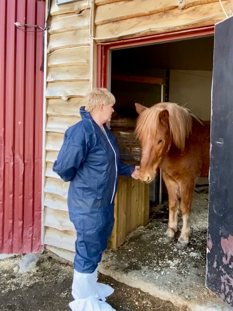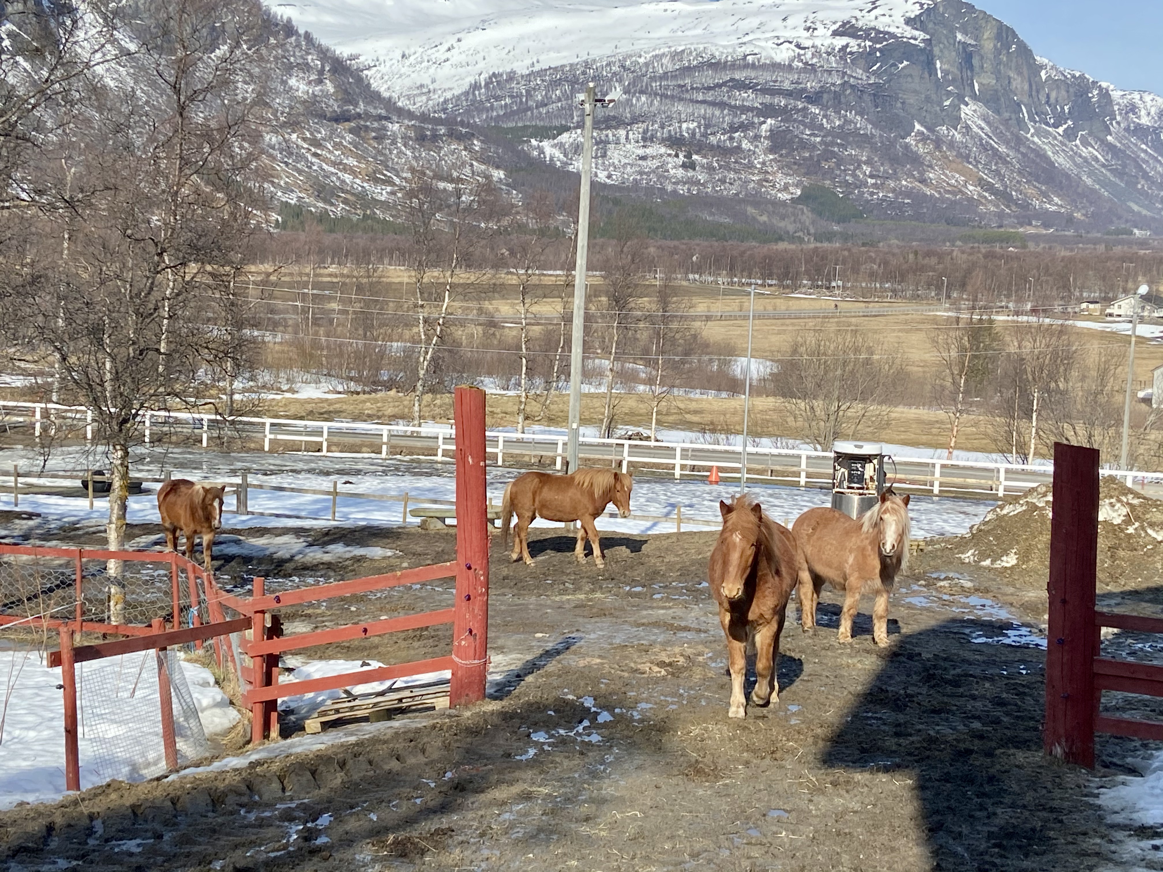 Birgit had planned two visits to blood sample goats, but there were some last minute cancellations and so we visited some sheep farms to check ear tags instead. I am taking a course at the moment on inspections, and so Birgit let me lead both of them. Better still on the first farm, as well as the sheep, the owner had some Lyngshest/Nordlandshest. These wonderful little Norwegian horses are immensely strong and hardy. Most of them are between 12.3 and 13.3 hands (130-140 cm) but Birgit assured me they can easily carry an adult’s weight. She had told me before we arrived about the little horses – she has some herself – and so when we had checked the sheep, I asked the farmer whether we could see them. He led us outside, and to my delight, he called them and they began slowly to walk towards us.