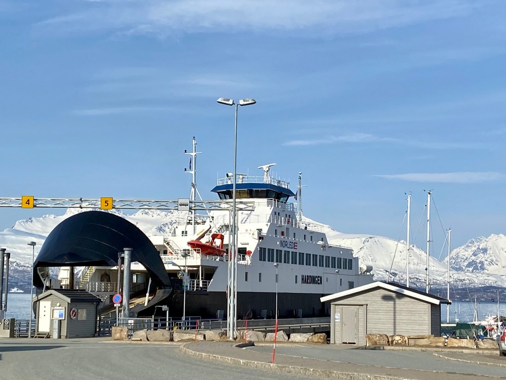 Our destination was Lyngseidet in Lyngen Kommune. Though it is possible to drive round, it would take several hours. The crossing took about forty minutes and as well as taking photographs, Birgit and I bought drinks from the small cafe on board. I had a slightly surreal moment when I approached the lady behind the counter and she spoke to me in English. Given that I was wearing a Mattilsynet jumper with a Mattilsynet badge hanging from a Mattilsynet lanyard, and was waving a Norwegian credit card, I was slightly taken aback. Perhaps my face looked British, but I didn’t ask so I guess I’ll never know.