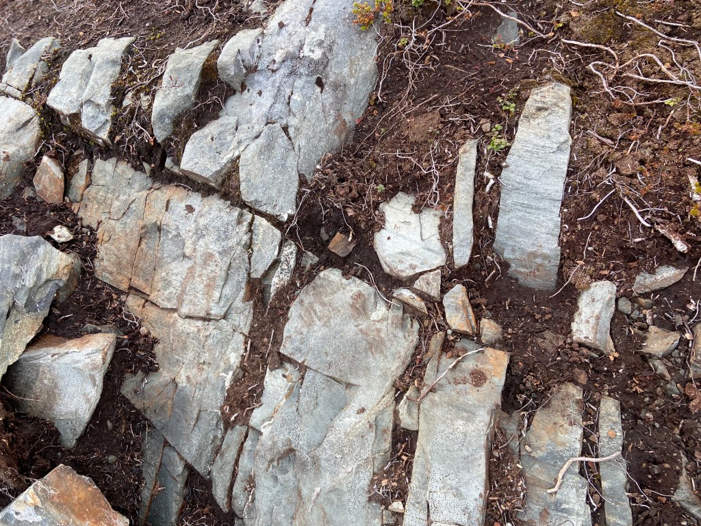 I asked him how the cracking occurred and he pointed to another section of rock just to the left, where there was more rock in the process of arriving there. This had earth in between the cracks, which of course will hold water. It freezes in winter, driving the stones apart, and then eventually the mud gets washed away, leaving the rather mysterious looking holes in the mountainside.
