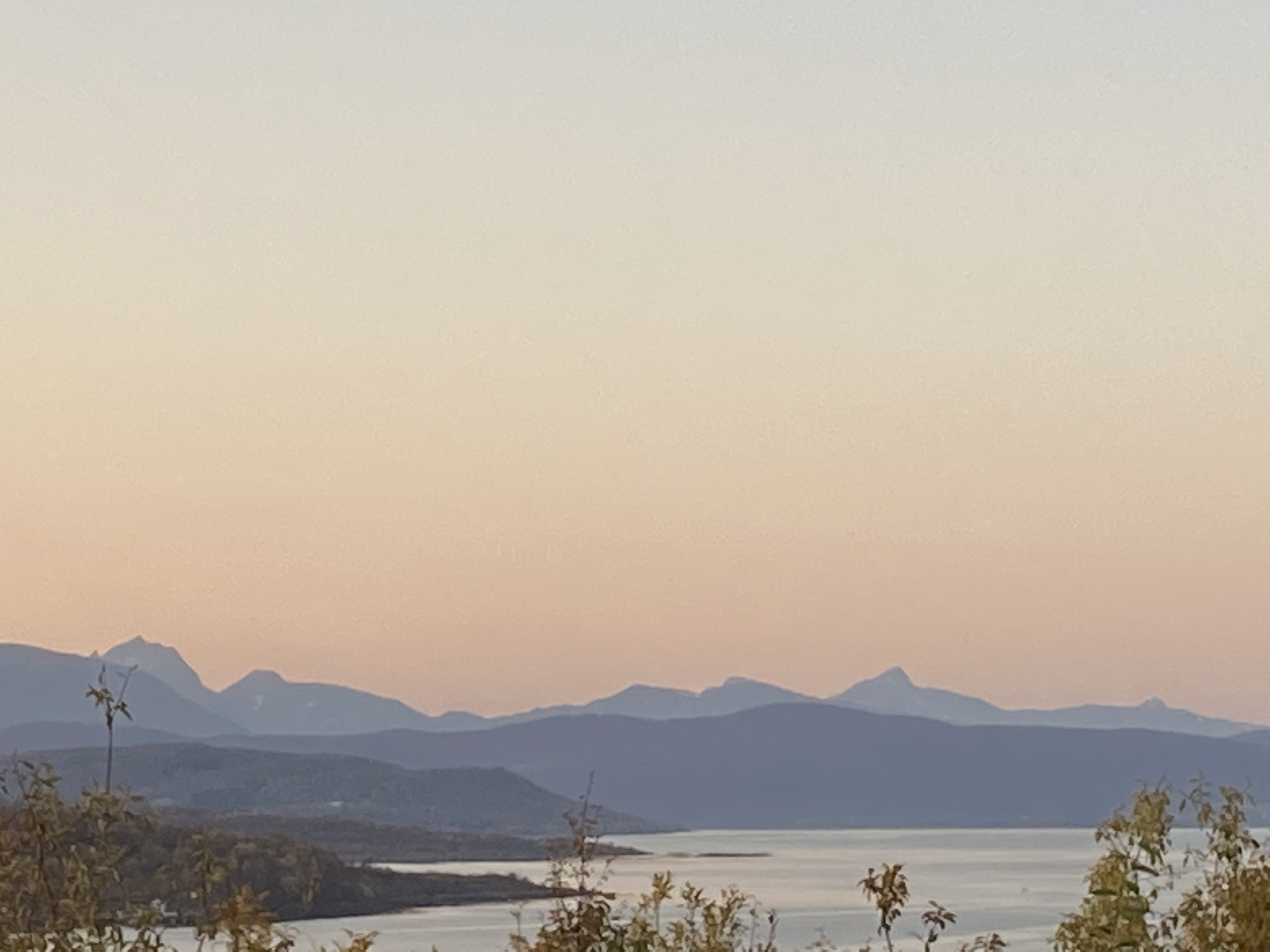 Andrew was due to return last night in the evening and the airport is close to the abattoir, so rather than driving over there twice in a day, I decided to take Triar in the car, have dinner with John, and then wait. It was a little hair raising, driving over. Until now, the temperature has been well above zero, but a wind from the north has changed that, and when I left for work at 04.45 there was frost on the car. I still have the summer wheels on as I don’t use the car much and up until now, they have been fine. I will change them over next week, but for now I had to proceed with caution in the darkness. I’d had to stop when driving home on Thursday, as there was a moose that thought about crossing the road, though he looked at all the cars which had stopped to let him, and changed his mind. They’re huge when you see them close up, so I was very wary, but we made it there safely. To fill in the time between work ending and collecting Andrew, I took a quick reprise of the spring fitness project. This is how the landscape looks now, as we head into winter. If you look carefully at the second picture, you can see the white peaks in the distance, though they are rather swathed in clouds.