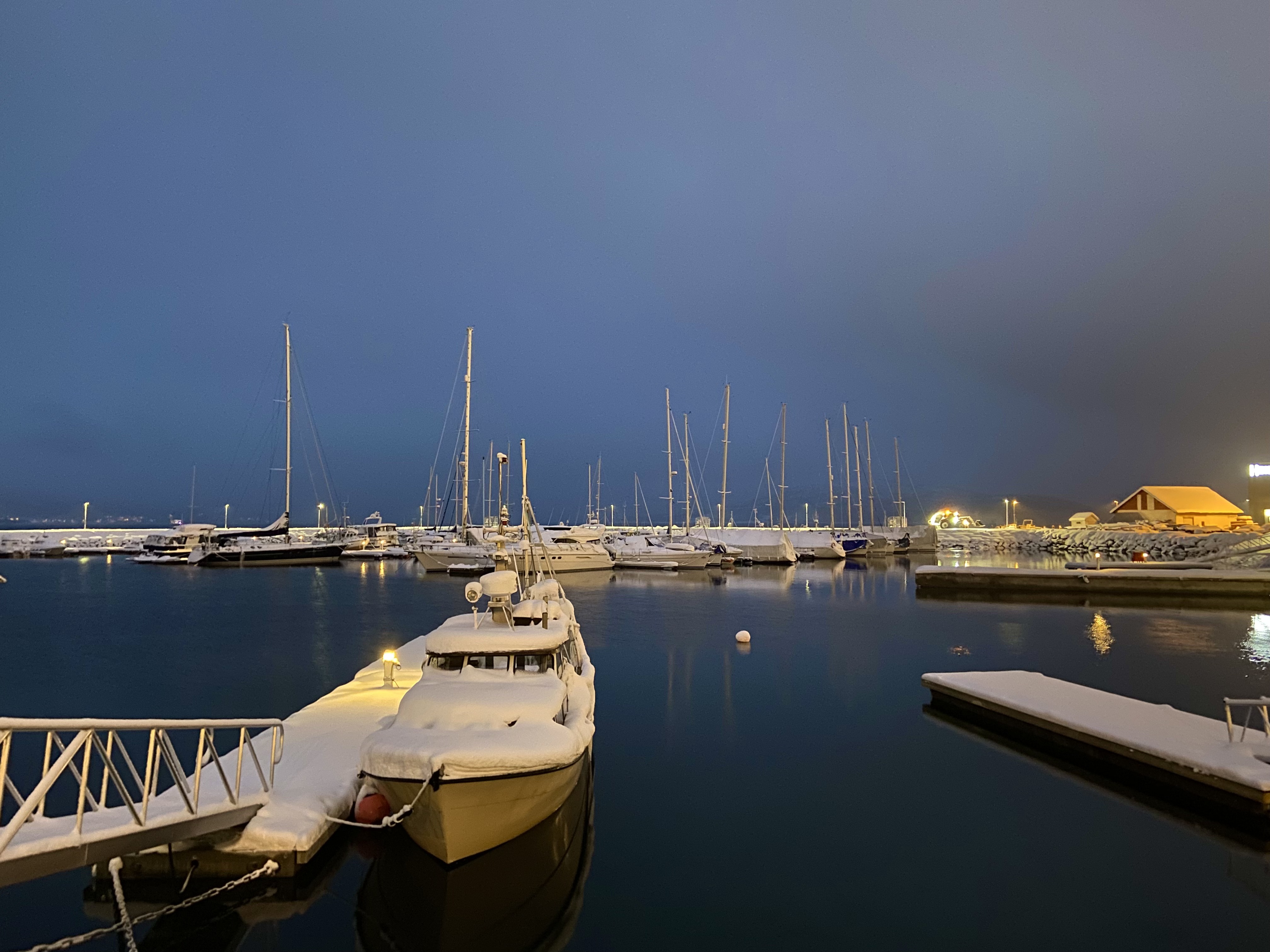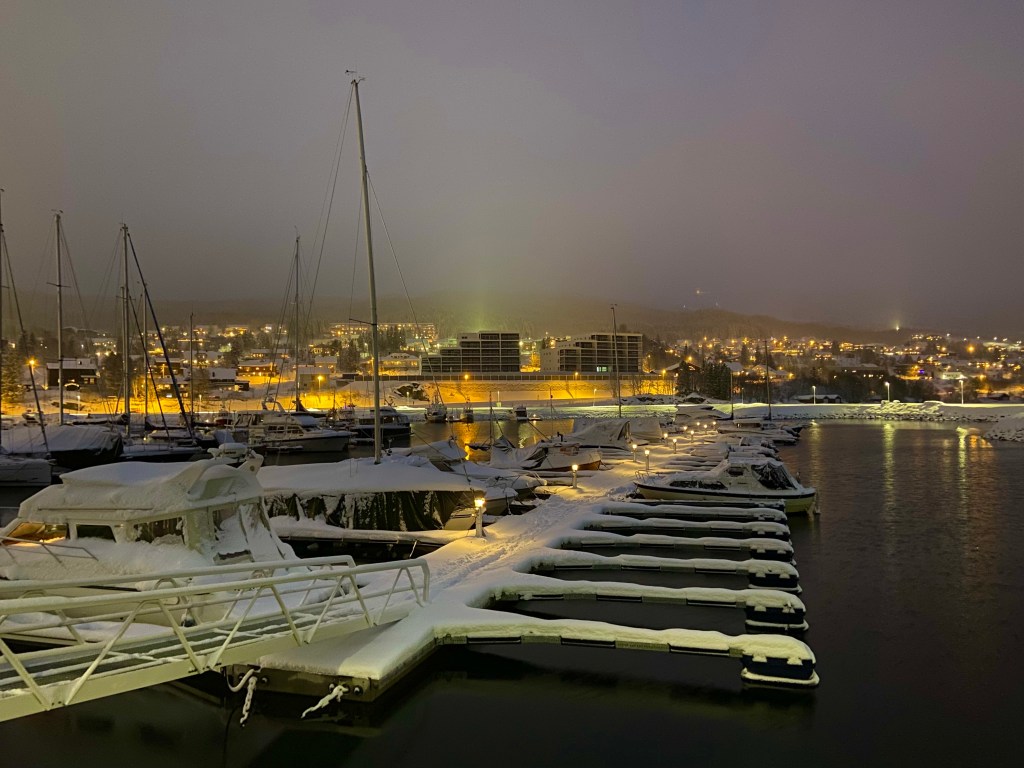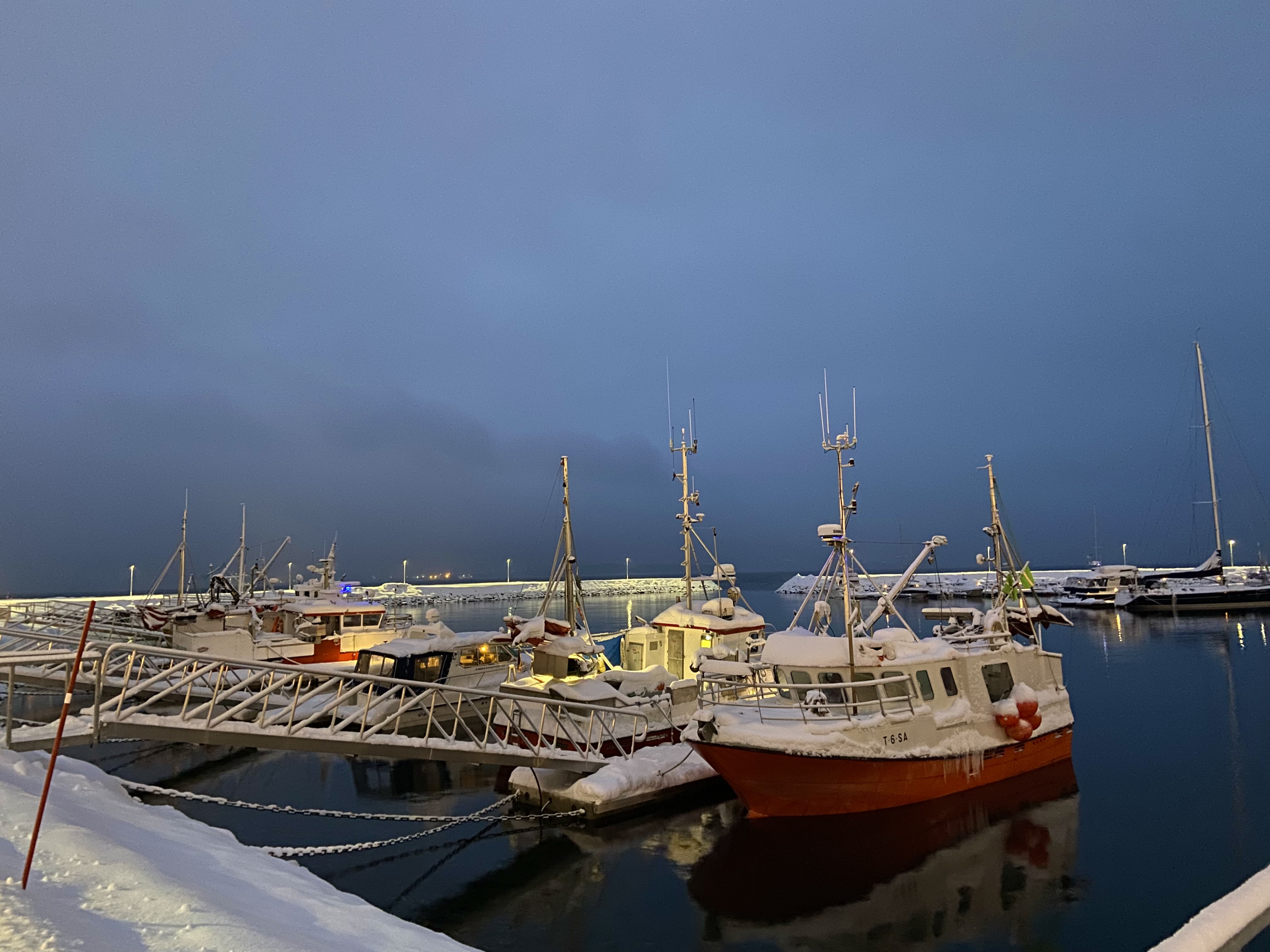 I had a lovely restful weekend last week. It was snowing for much of Saturday, but in the evening I took Triar out for a stroll around the harbour next to where I work. It’s a small, quiet place. I believe you can buy fresh prawns from one of the fishing boats, but at this time of year, there isn’t much coming and going.