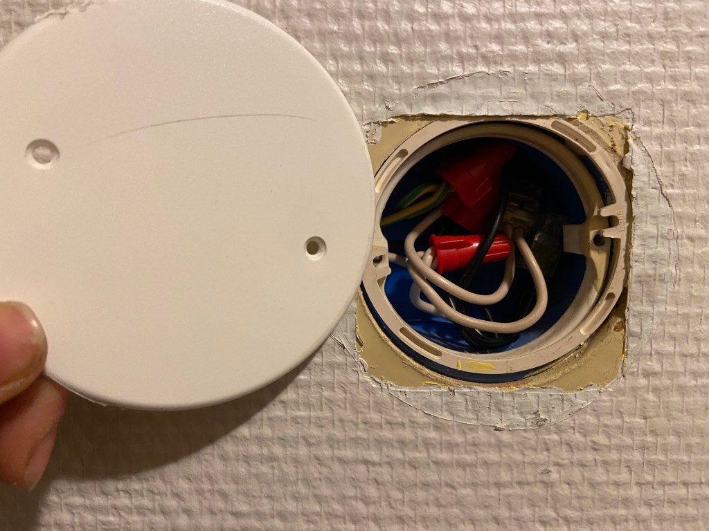 John took down that board last week and I wish I had taken before and after pictures. The hallway immediately felt twice as big and much brighter. I hadn’t realised how much light that board was blocking. Having seen the wood panelling Stejn has put up in various areas of their house, it struck me that, rather than trying to remove all the wallpaper from the entire hallway, in order to match the small area where the wallpaper is a mess, perhaps we could put up an area of wood panelling and make it a feature. The area that used to be a cupboard is wider than the rest of the hall, so it would be relatively easy to do and would look like quite a natural part of the hallway to pick out. There is another small mystery to solve however. In that area, there was a small, round plastic patch that was obviously covering something. John unscrewed it and we found some kind of electrical wiring point behind it. Whether it needs to have future access, or whether it was installed and the white plastic patch was just to cover the hole is a mystery to us, but obviously one we have to find out before we put any panelling in place.