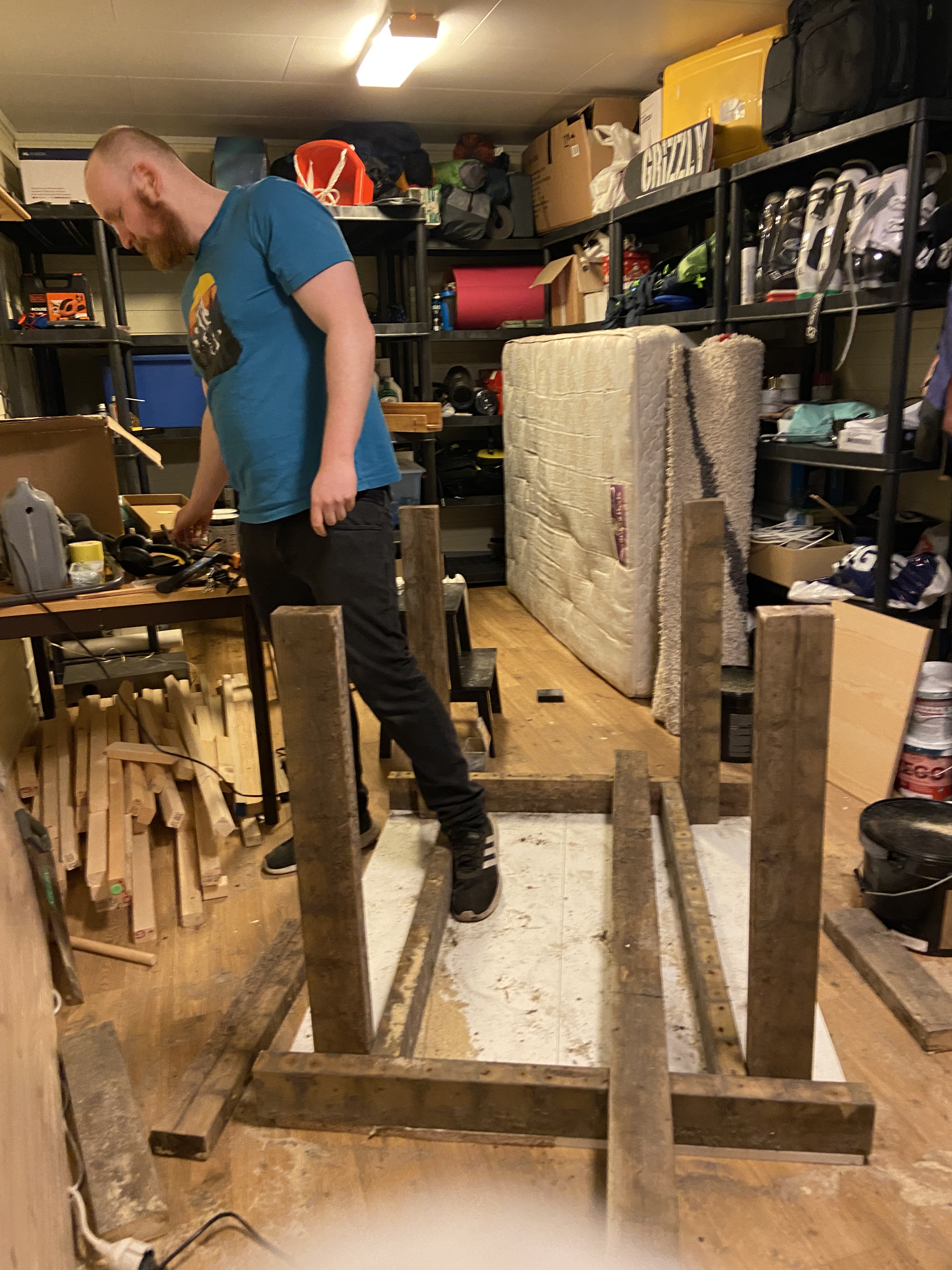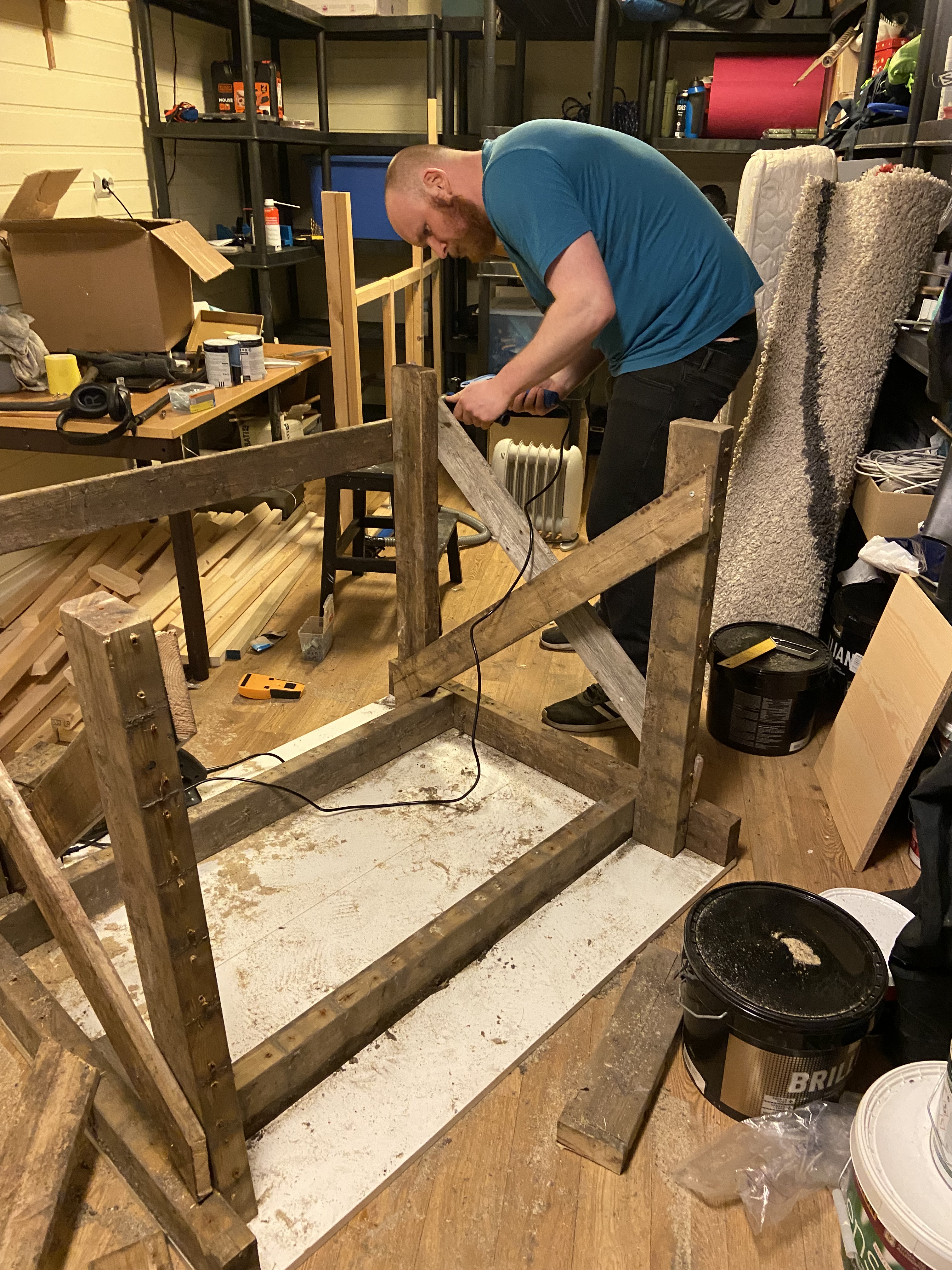 John also disappeared out to the room next to the garage one evening this week, then came back in to ask for my help. He was building a workbench from the board he’d taken down from the hall and some old wood from the uneven decking that he and Andrew took up from the back garden before the snow came. I’m never sure where John picked up his carpentry skills. Neither I, nor his father, have any talent in that direction, though my dad is quite good. I did ask, but John couldn’t give me any clear answer, only that he’d just picked it up. Either way, I was impressed he’d built a sturdy workbench from scrap material.