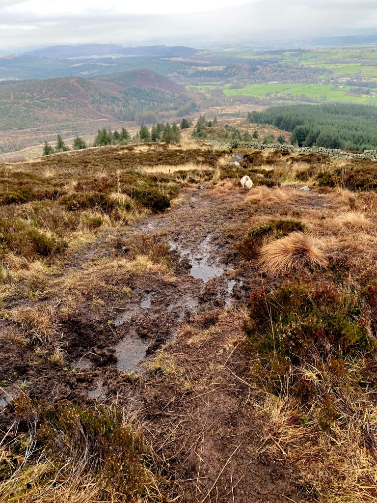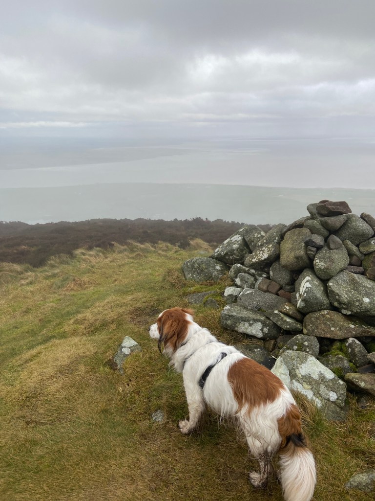 Last week, Triar and I walked up Knockendock, which is a smaller hill attached to Criffel, which we walked up last summer. It was a bit misty on top, but Triar posed very prettily beside the cairn, as you can see in the picture at the top of the page. There was a great view from nearly the top and I survived walking through a high-level peat bog without unexpectedly sitting down or falling on my face, which was undoubtedly a result!