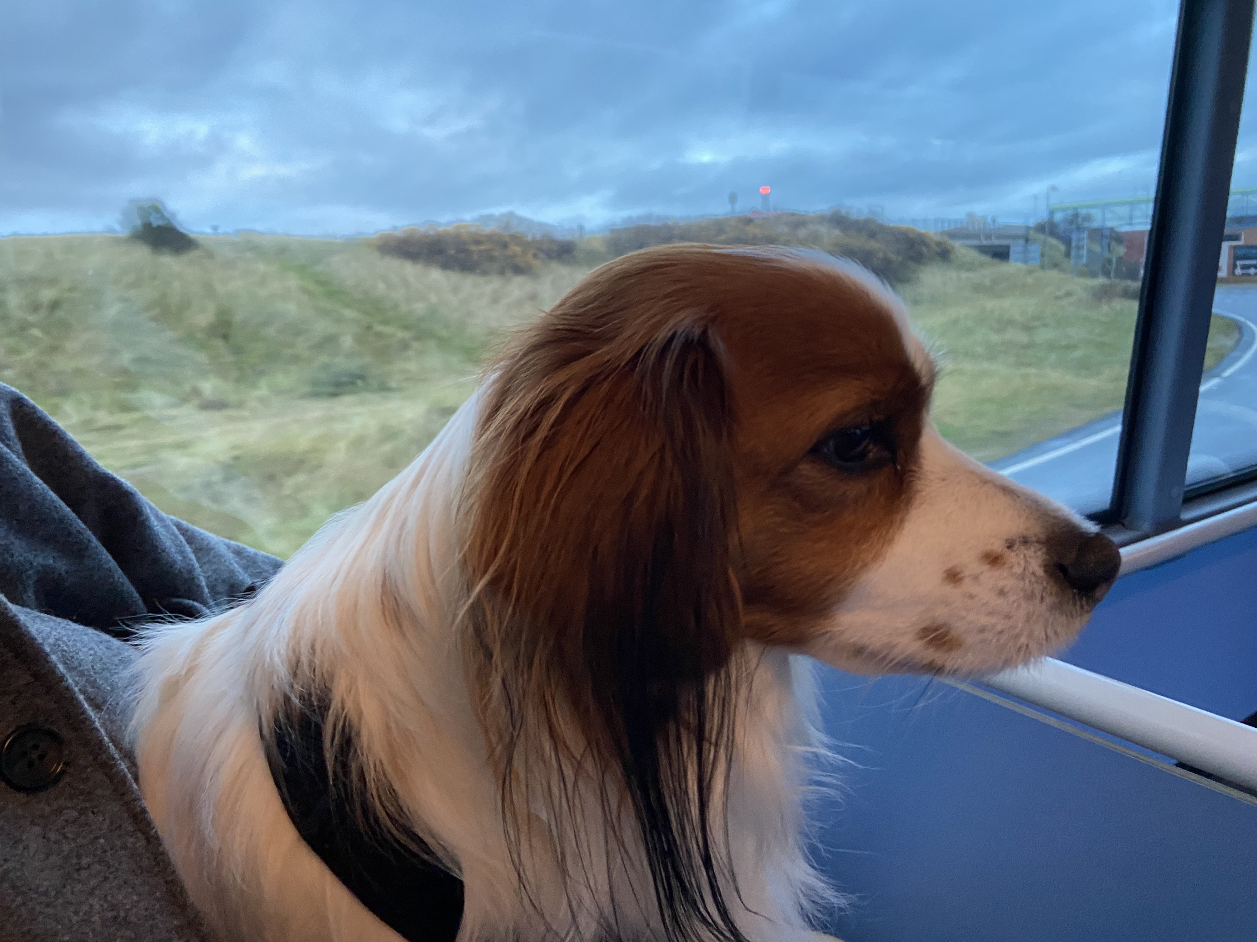 We had booked a taxi for 08:30 to take us from the dock to the railway station, but when I called the taxi firm, they said they had the booking marked for 09:00 and couldn’t get there sooner. Fortunately, there was a bus available, which we managed to hail, just as it was about to leave. We asked the driver whether we could bring the dog on board and he said of course we could.