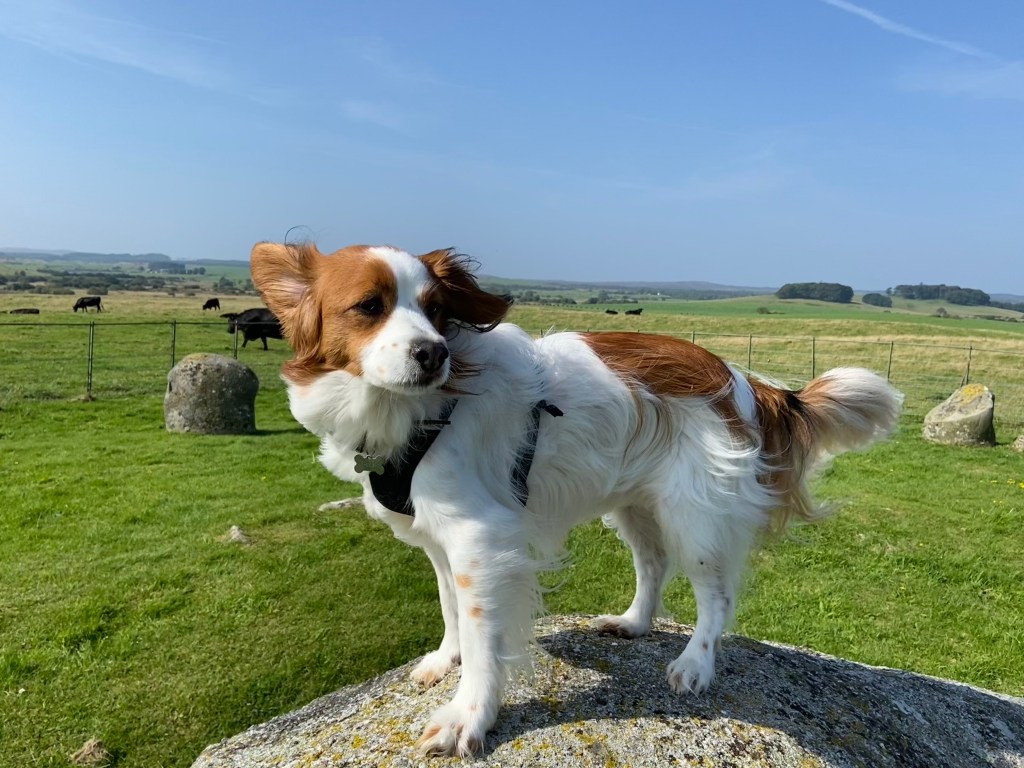 Last weekend, I made it to Torhouse Stone circle. I read somewhere, maybe at the site itself, that it consisted of a circle of “dumpy stones” but I see that Wikipedia calls them granite boulders, which sounds much better, so I’ll stick with that! There are nineteen stones in the circumference of the circle and three in the centre, and here, for the avoidance of doubt, is the Druid dog himself, who decided he would look very dashing, with his lovely silky ears getting all windswept and interesting.