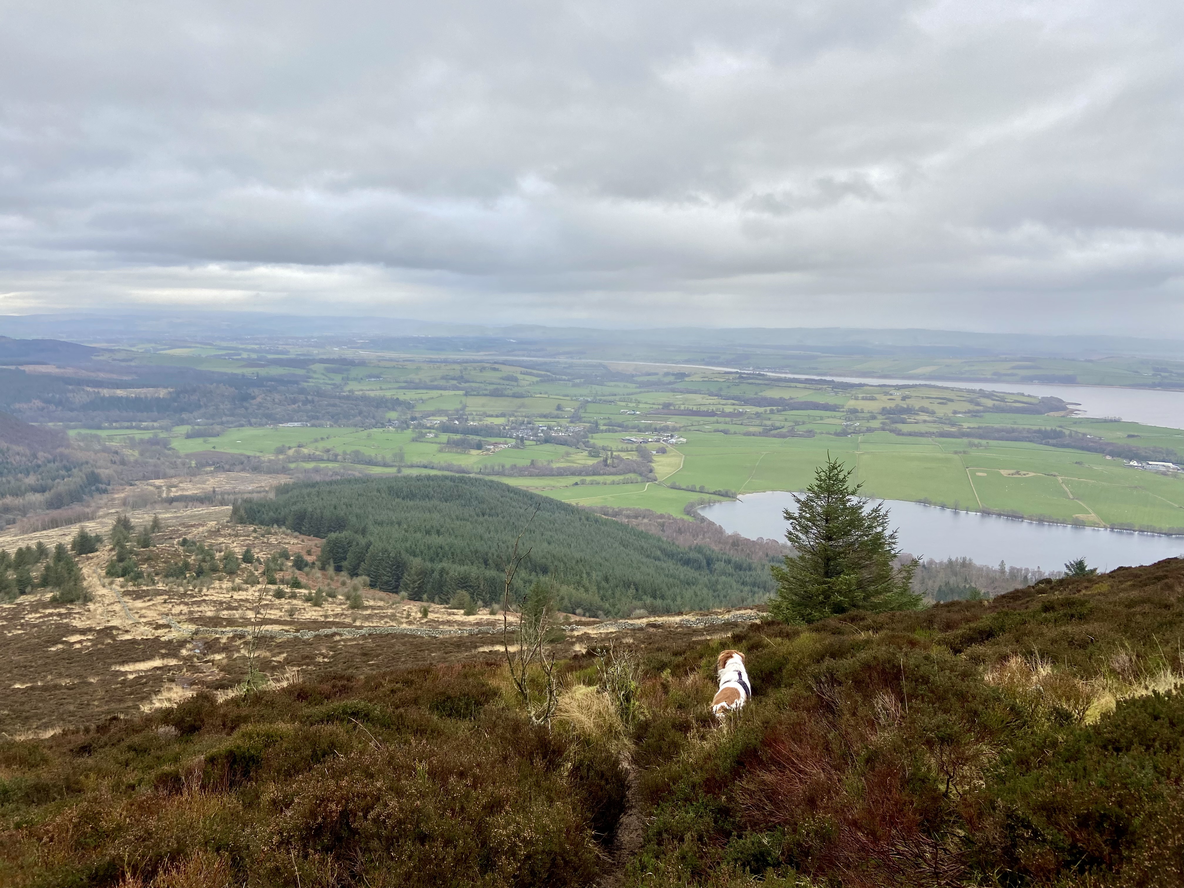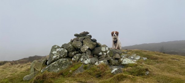 Last week, Triar and I walked up Knockendock, which is a smaller hill attached to Criffel, which we walked up last summer. It was a bit misty on top, but Triar posed very prettily beside the cairn, as you can see in the picture at the top of the page. There was a great view from nearly the top and I survived walking through a high-level peat bog without unexpectedly sitting down or falling on my face, which was undoubtedly a result!